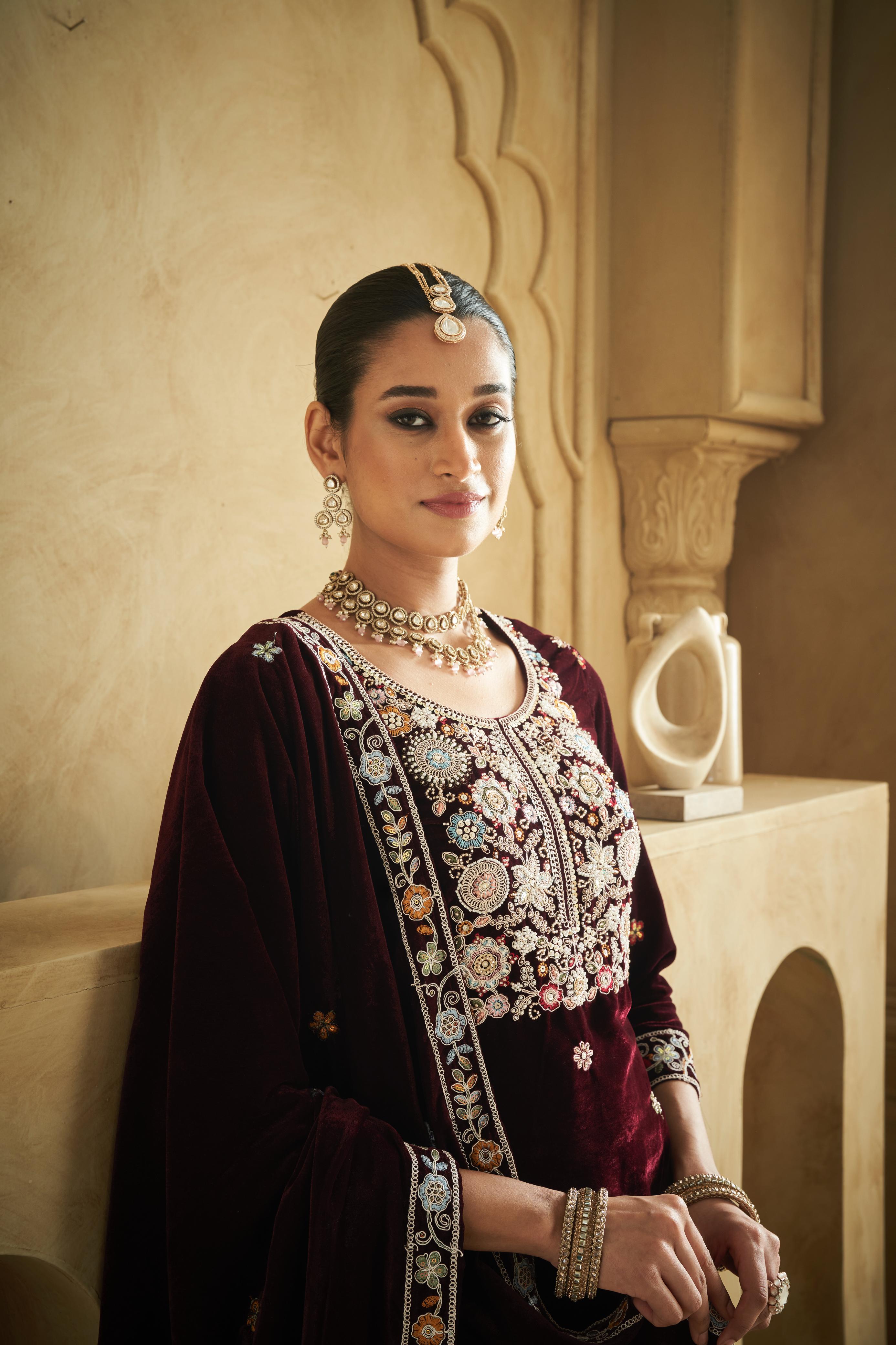 Purple Embroderied Work Velvet Semi-Stitched Plazo Suit