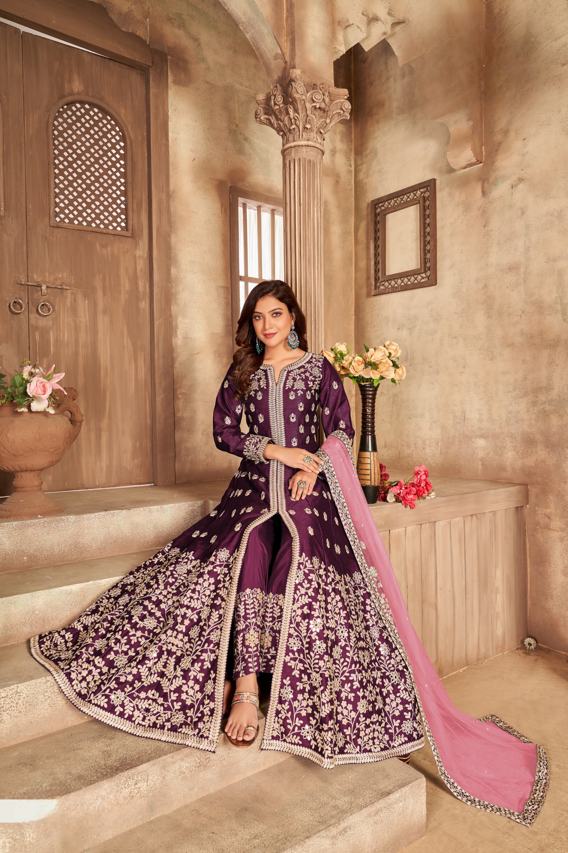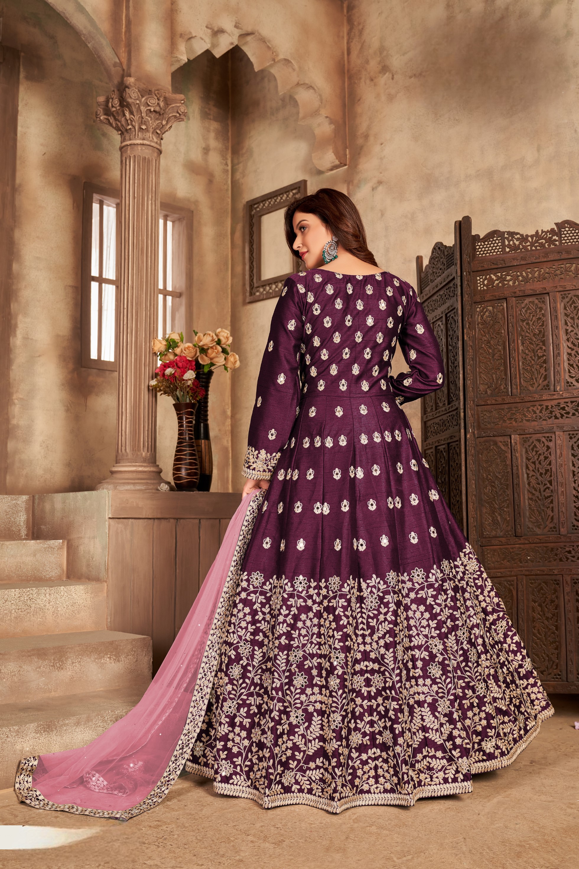 Purple Embroidered Art Silk Semi Stitched Anarkali Suit