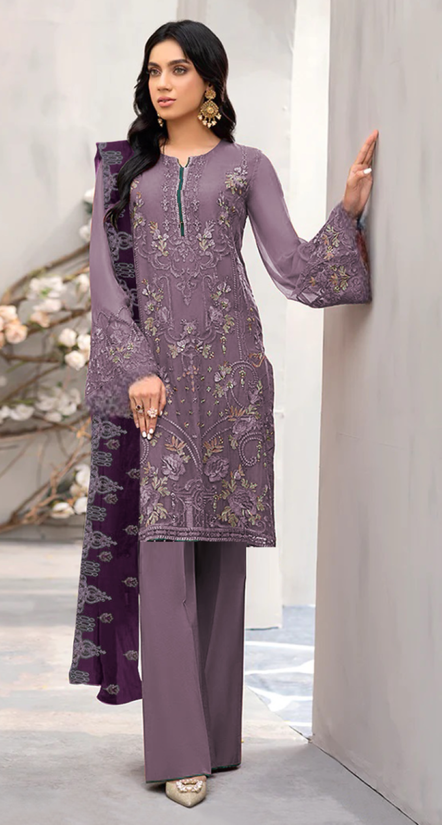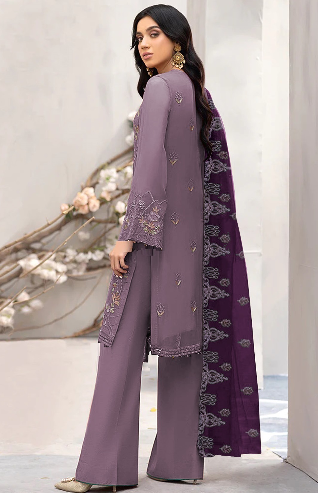 Purple Embroidered Faux Georgette Semi Stitched Salwar Suit