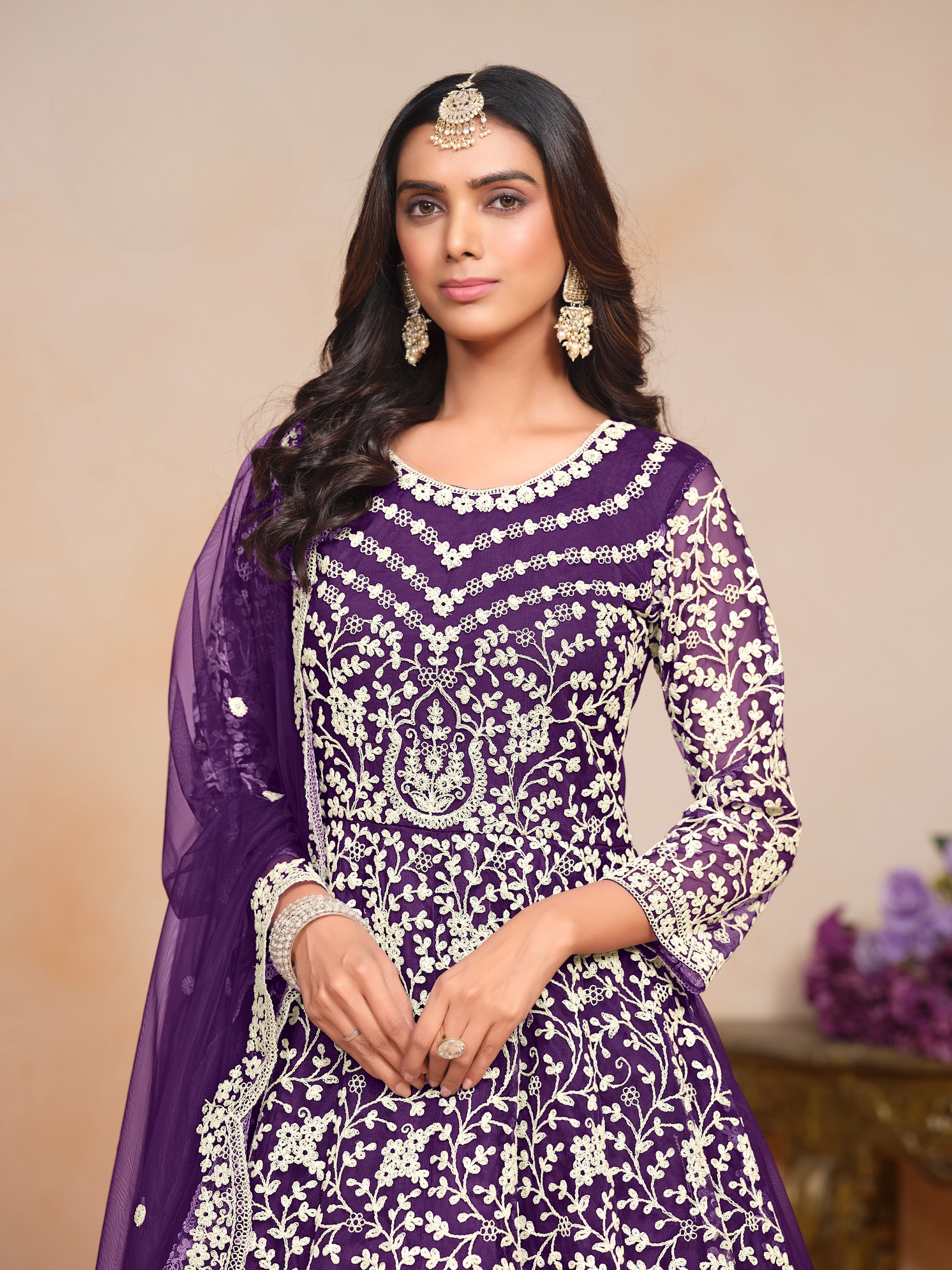 Purple Embroidered Net Semi Stitched Anarkali Suit