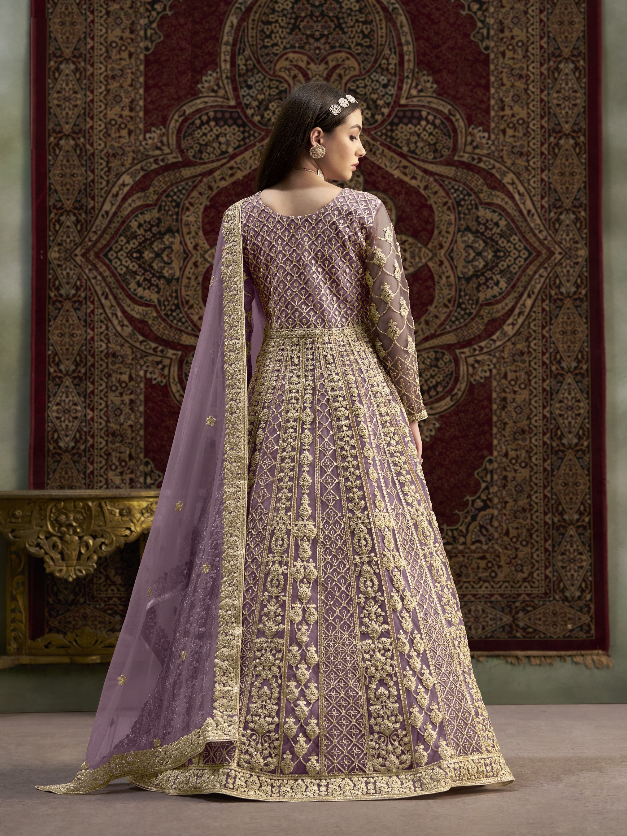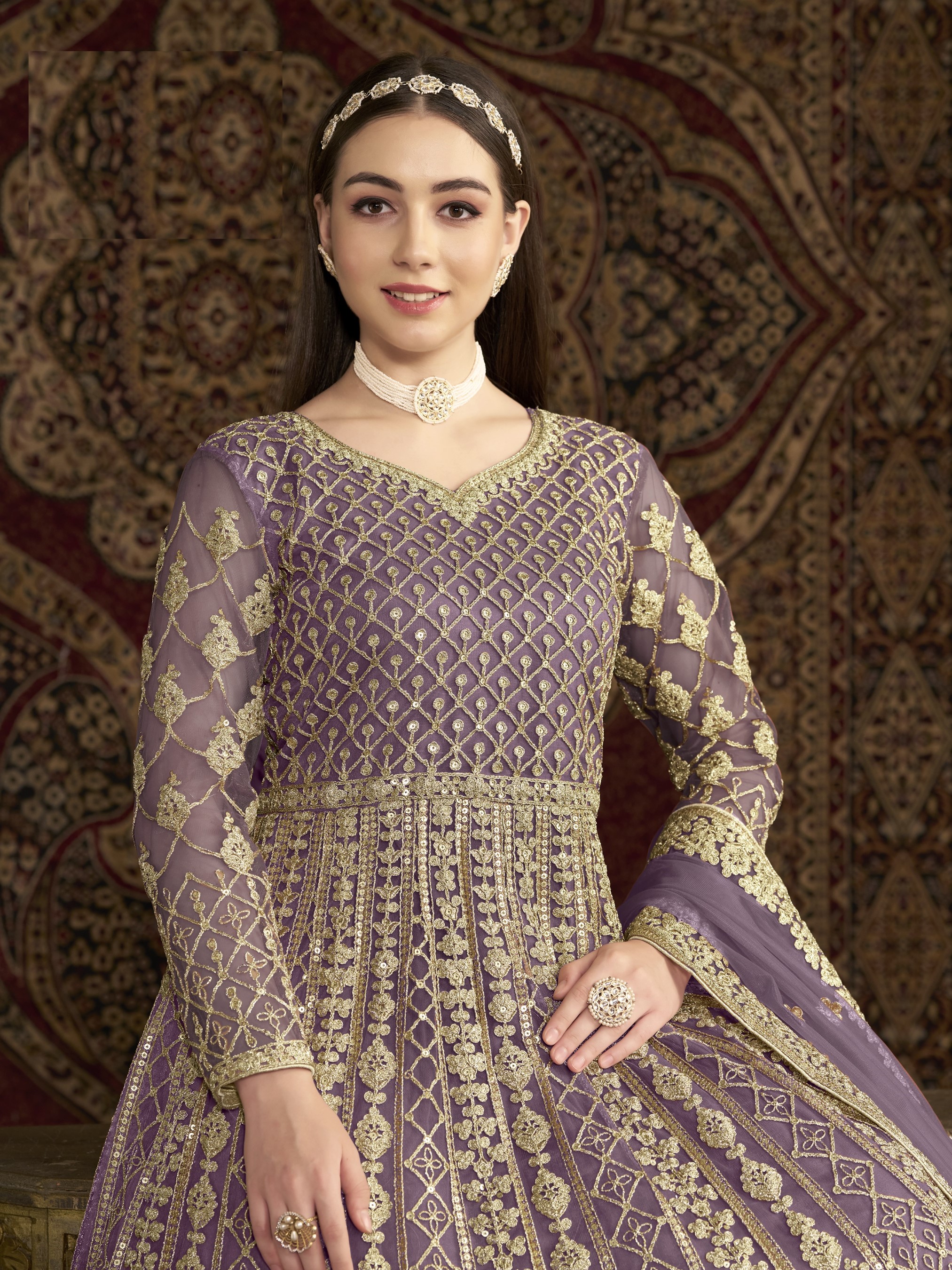 Purple Embroidered Net Semi Stitched Anarkali Suit