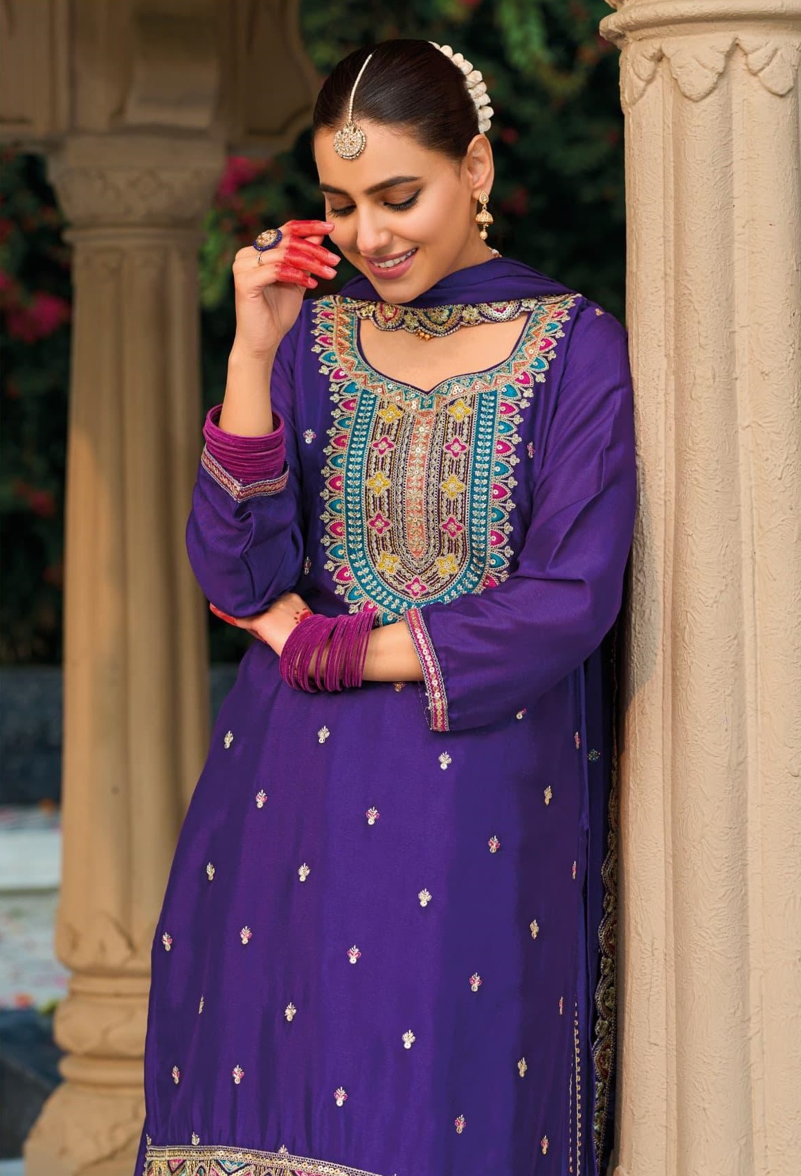 Purple Premium Embroidered Chinon Readymade Salwar Suit (Free Size)