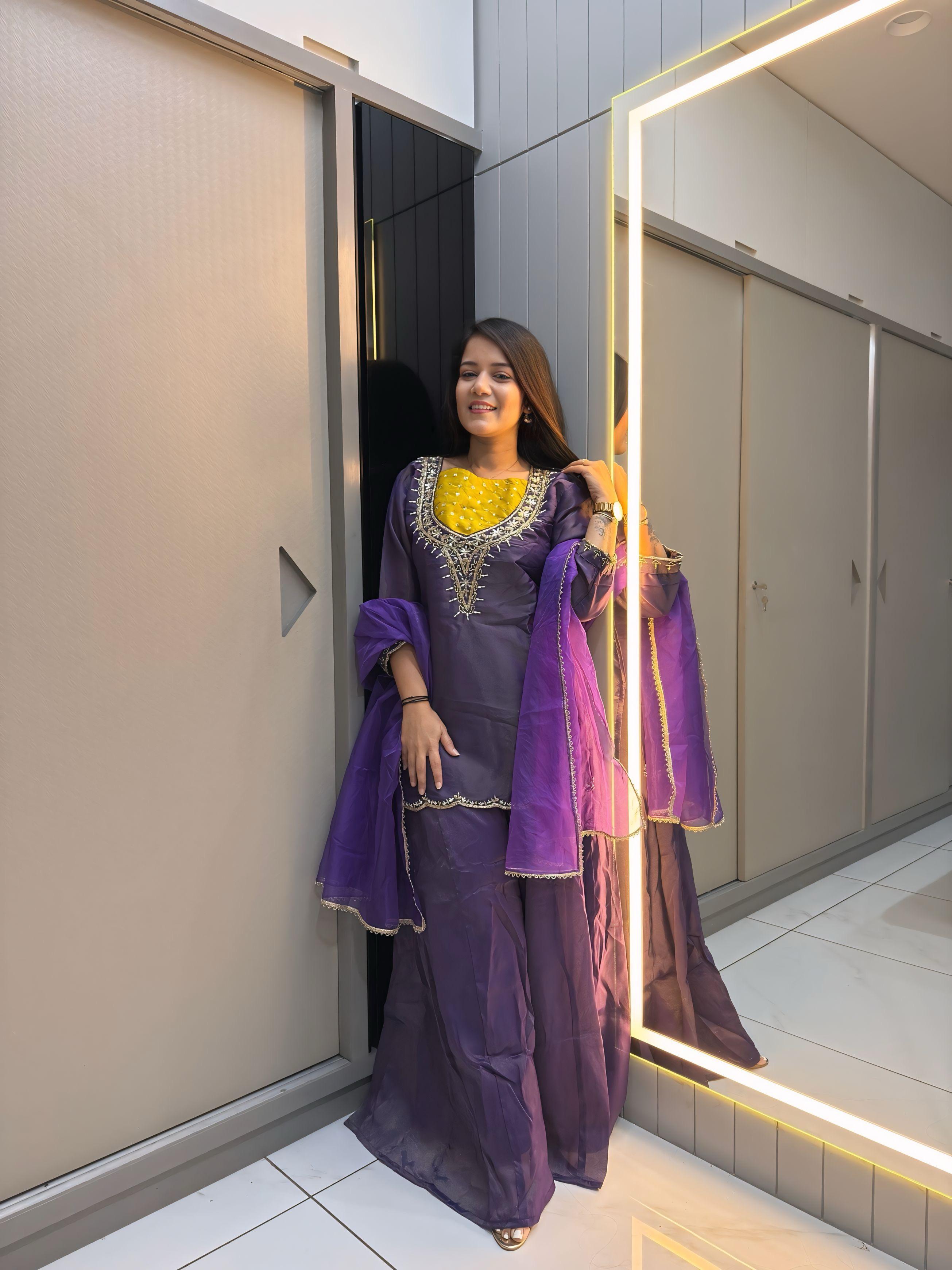 Purple Roman Shimmer Readymade Kurti Set with Handwork & Moti Work