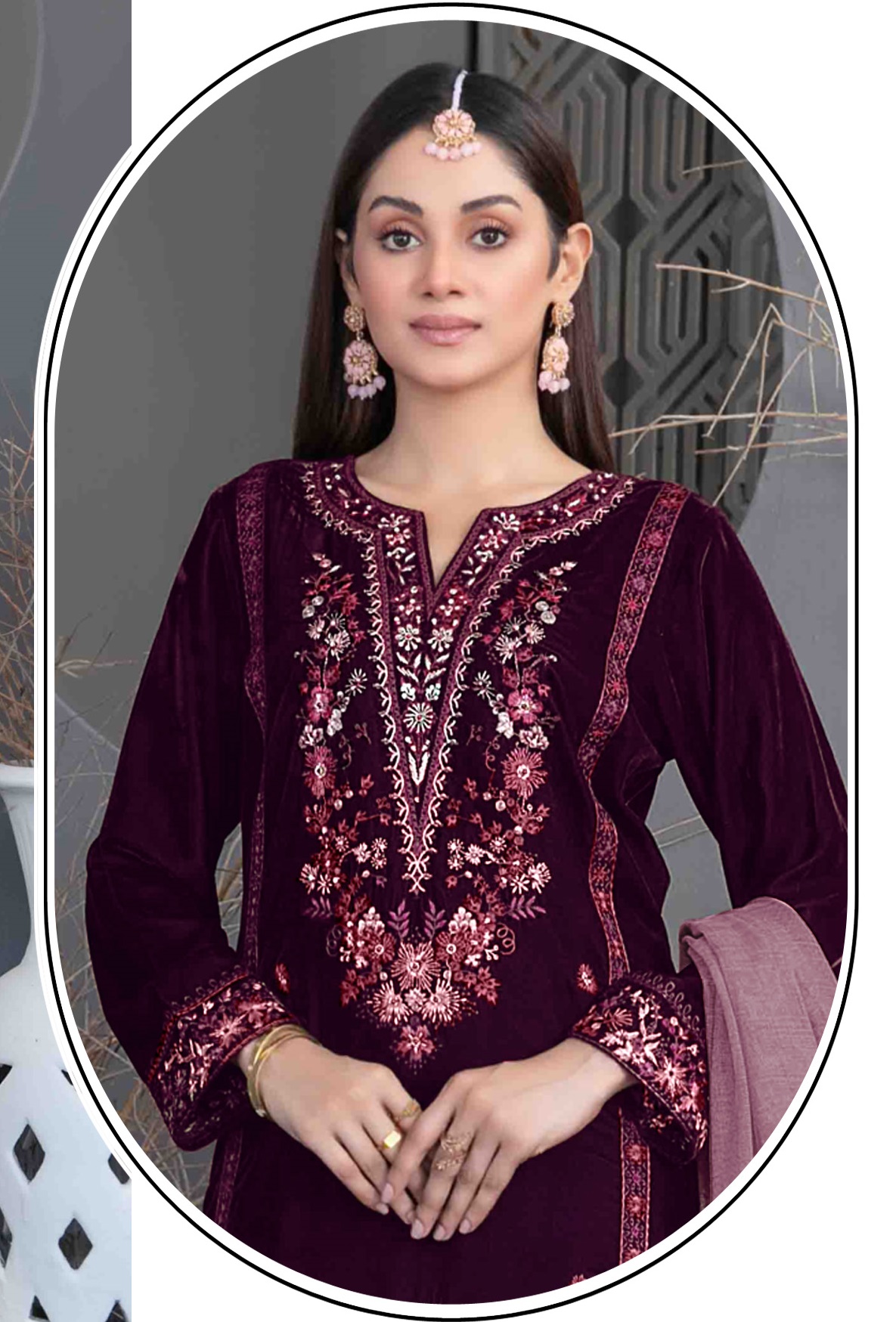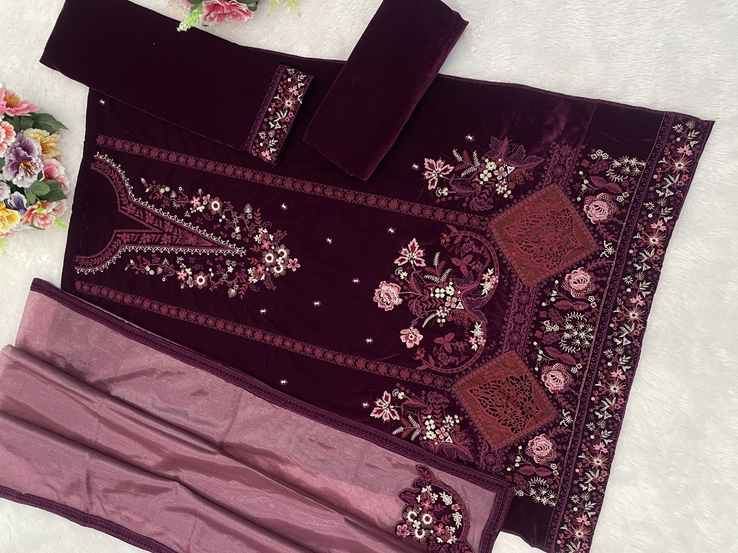 Purple Velvet Semi Stitched Suit with Embroidery Sequence Work