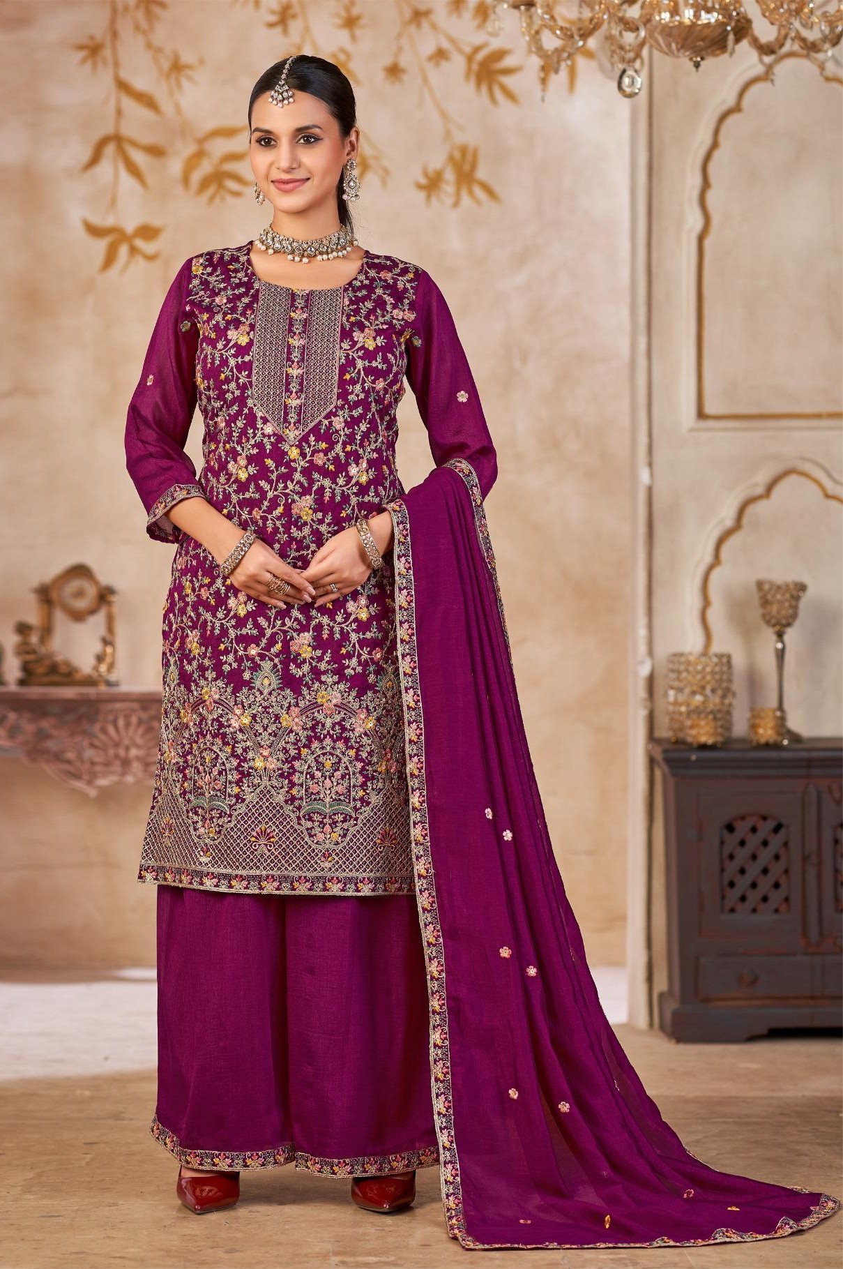 Purple Vichitra Silk Readymade Plazzo Suit with Embroidery & Lace Work