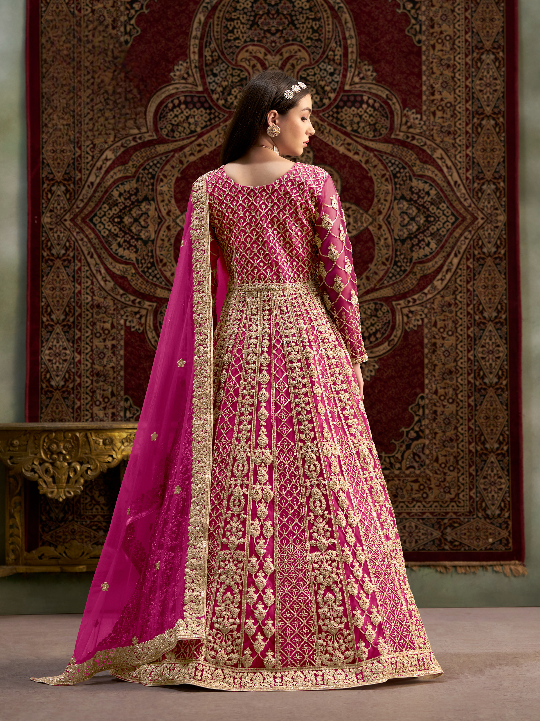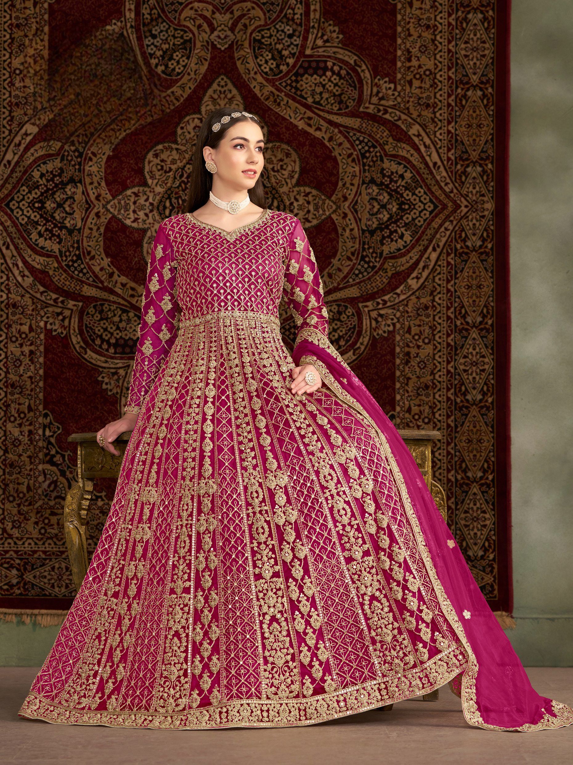 Rani Pink Embroidered Net Semi Stitched Anarkali Suit