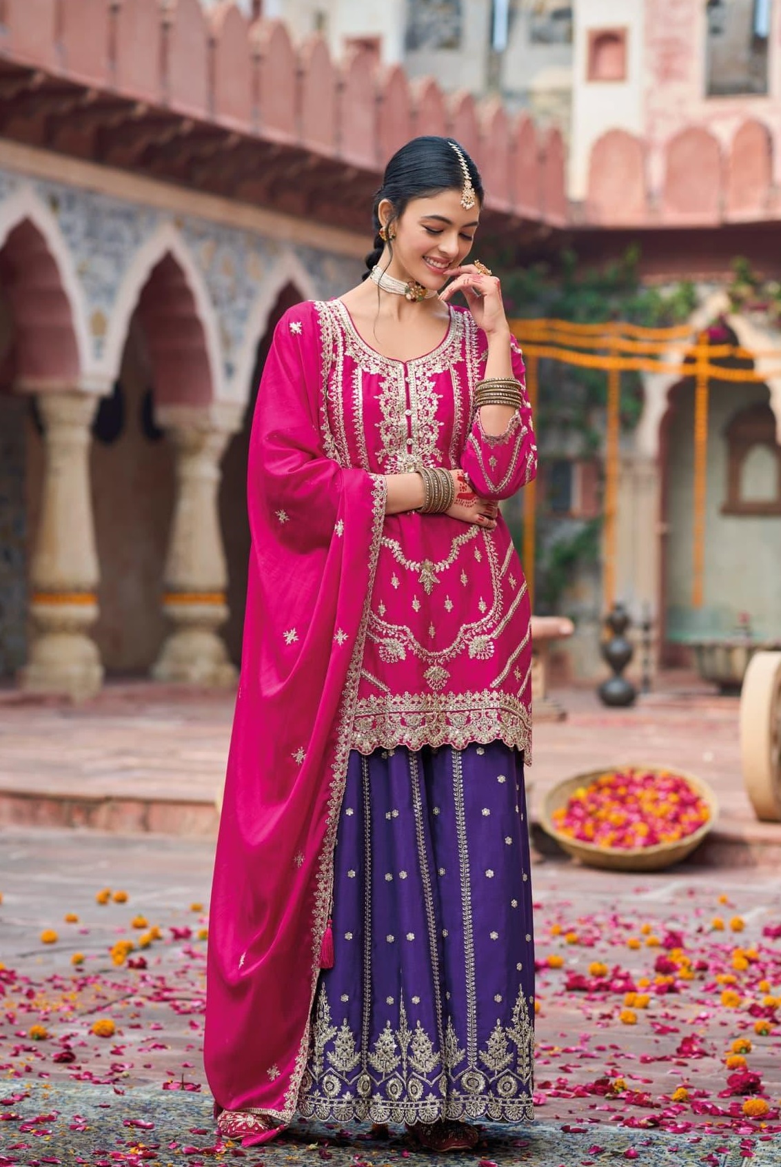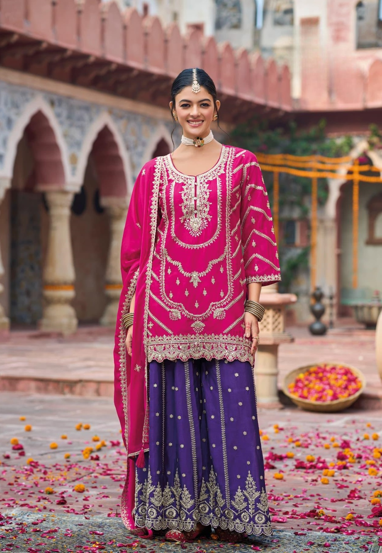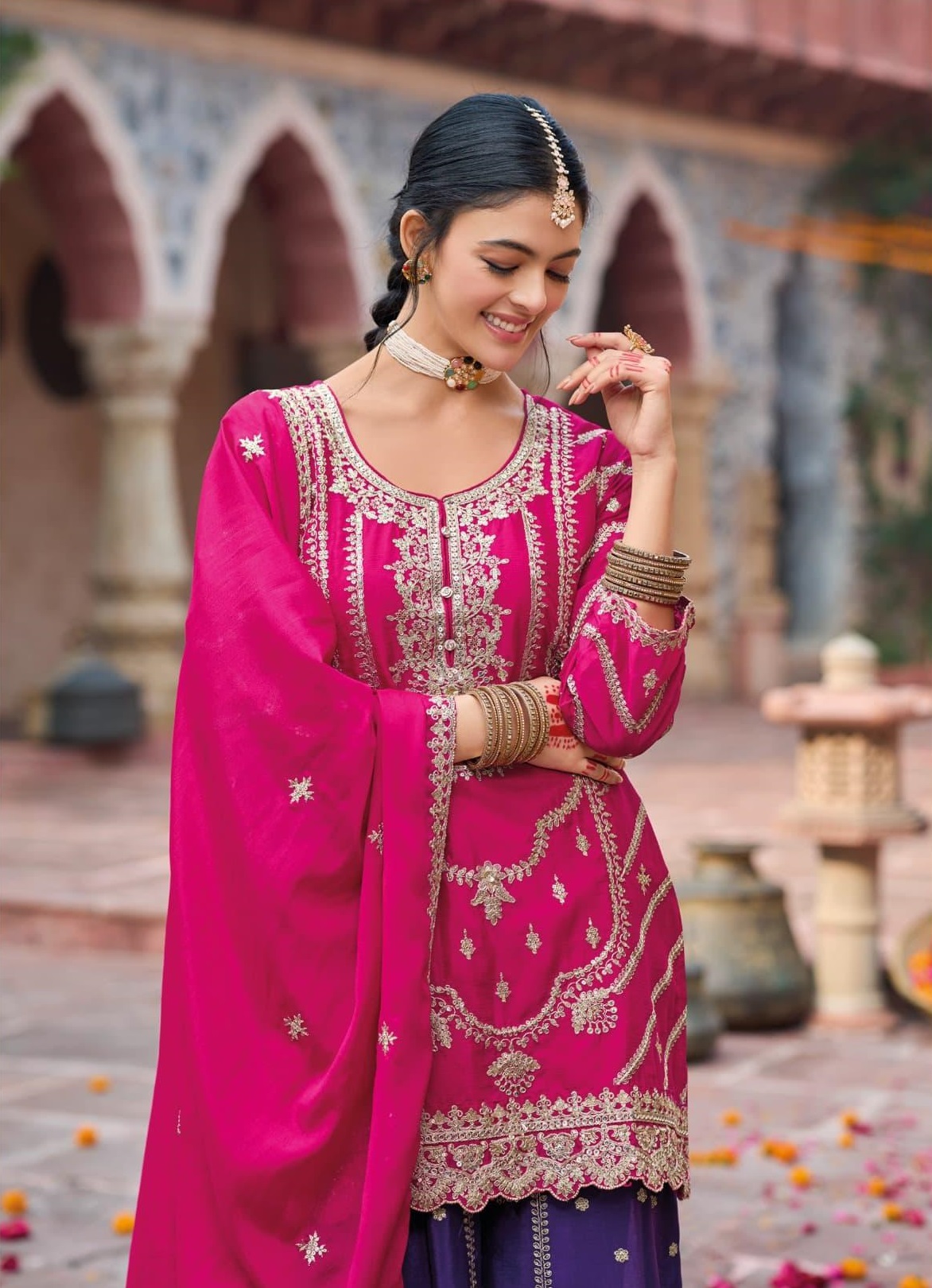 Rani Pink Premium Embroidered Chinon Readymade Salwar Suit (Free Size)