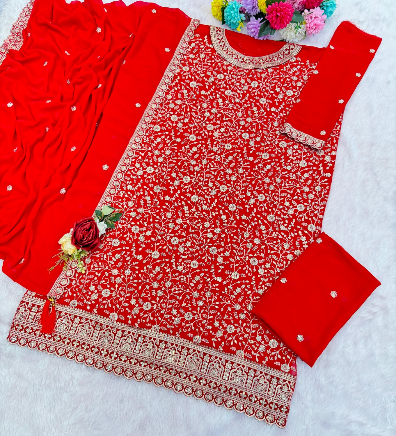 Red Blooming Georgette Semi Stitched suit with Heavy Embroidery & Sequence work