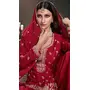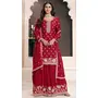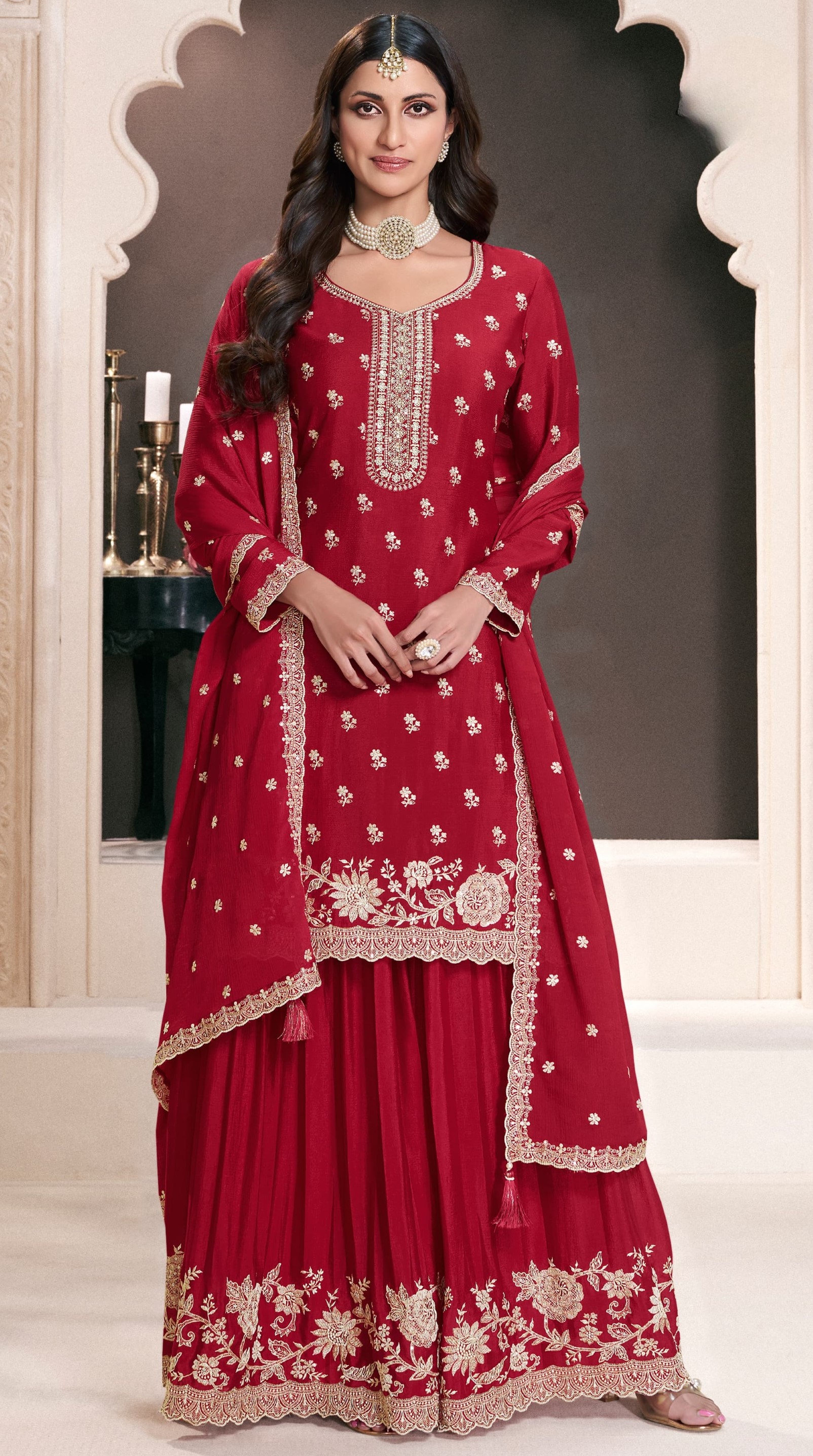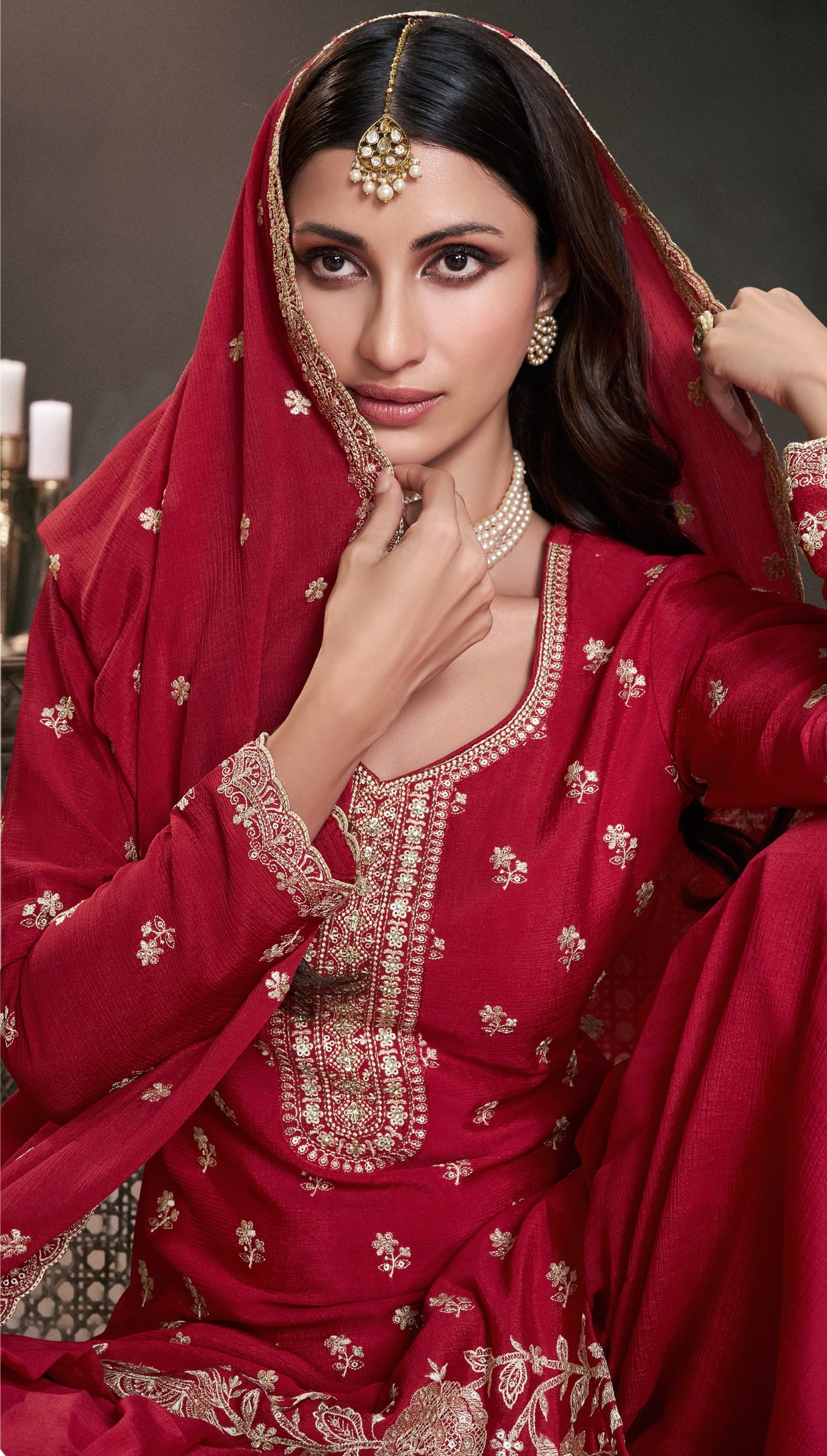 Red Chinon Embroidered Thread Work Semi-Stitched Salwar Suit