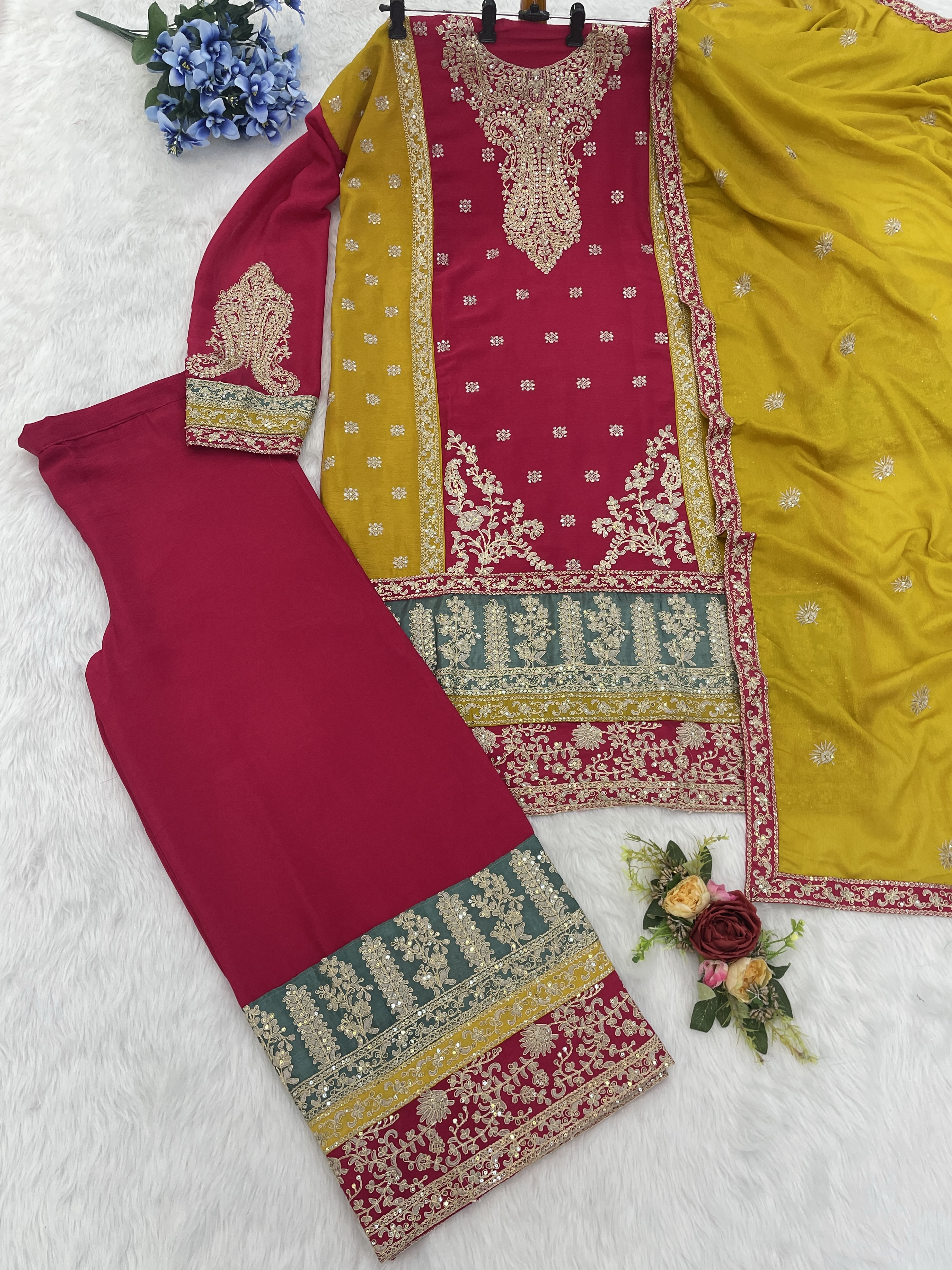 Red Chinon Semi Stitched Suit with Embroidery Codding Sequence Work