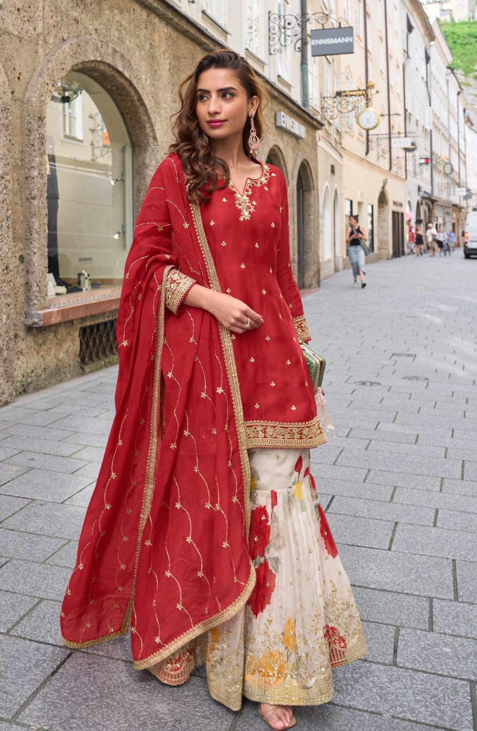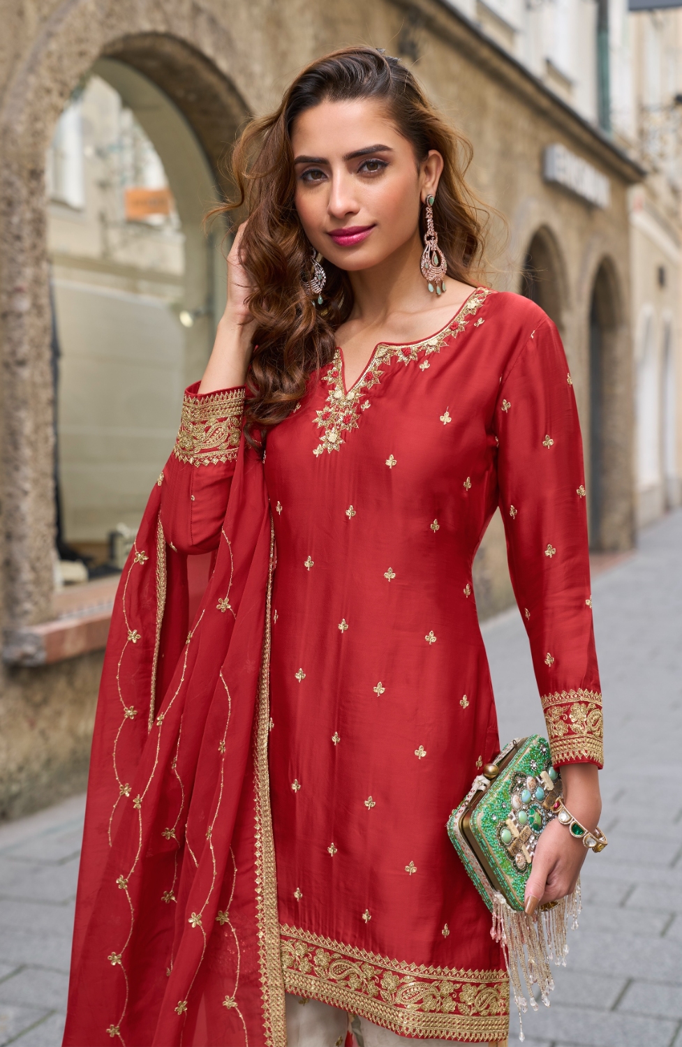 Red heavy chinon silk semi stitched palazzo suit with sequence work