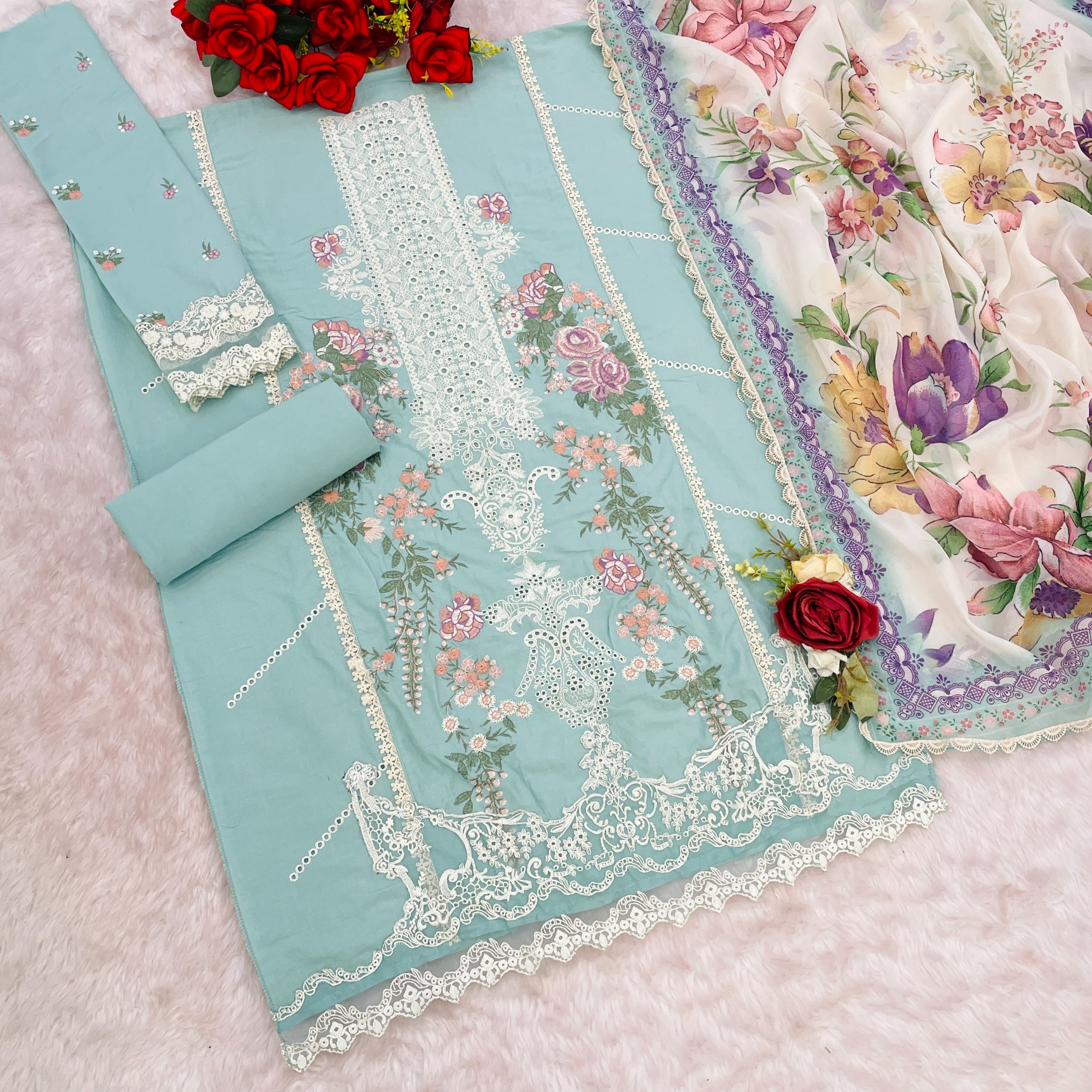Sea Green Embroidery Thread Work Cumbric Cotton Semi Stitched Salwar Suit