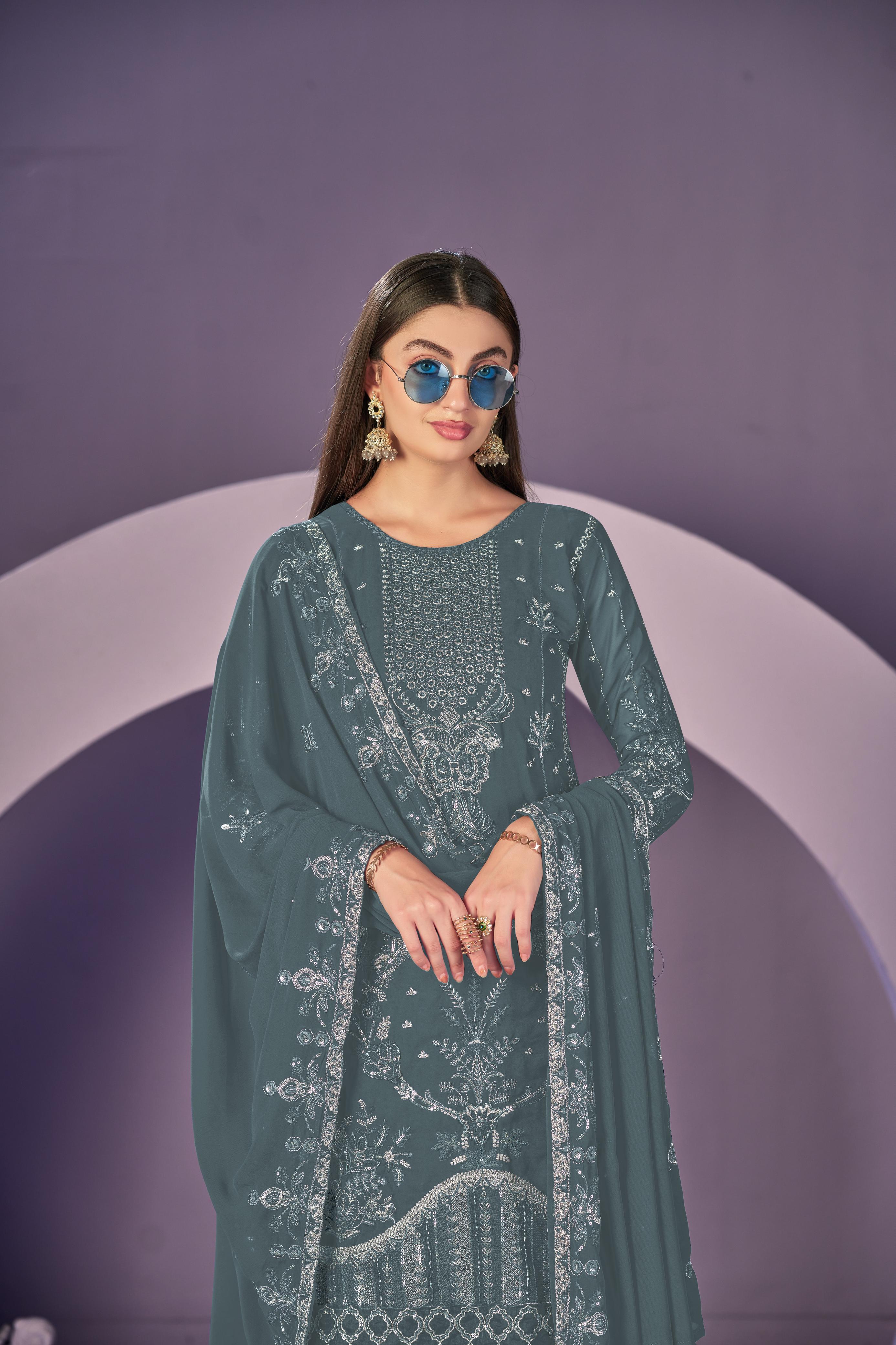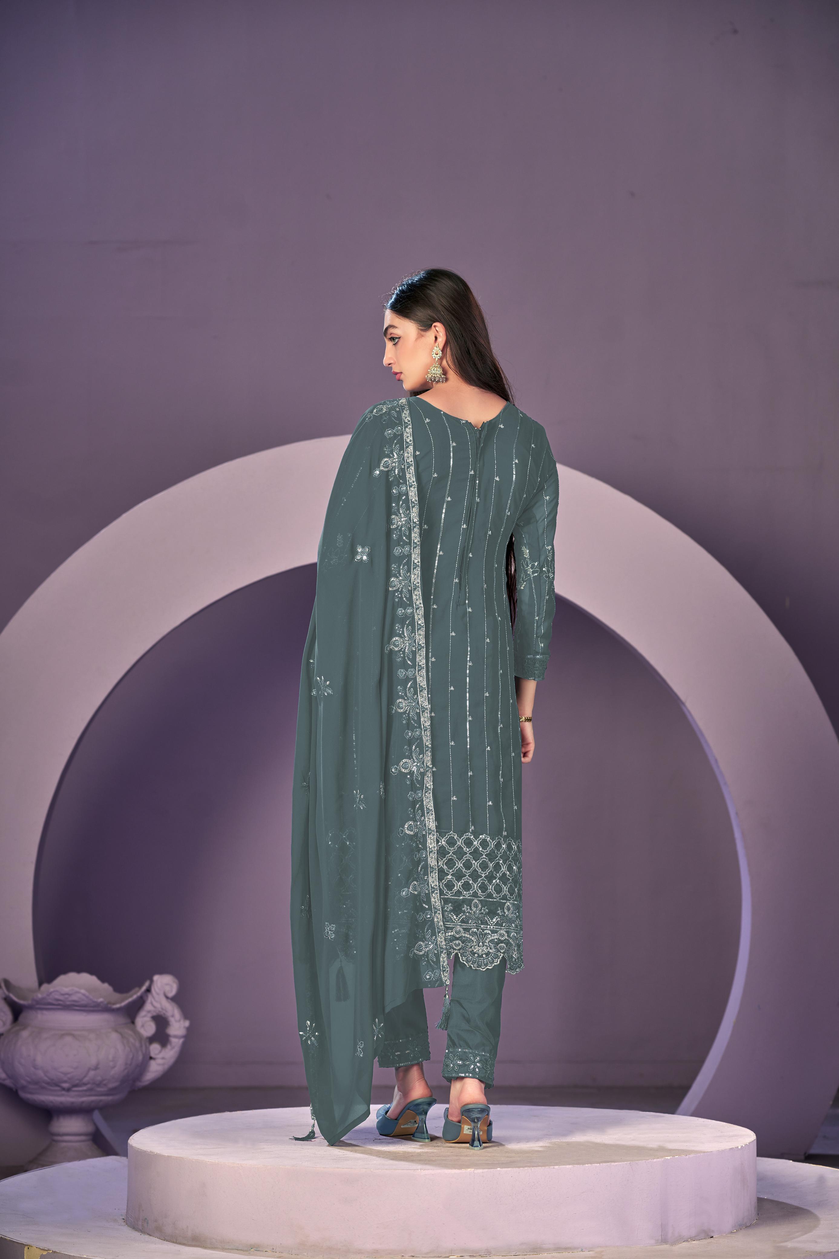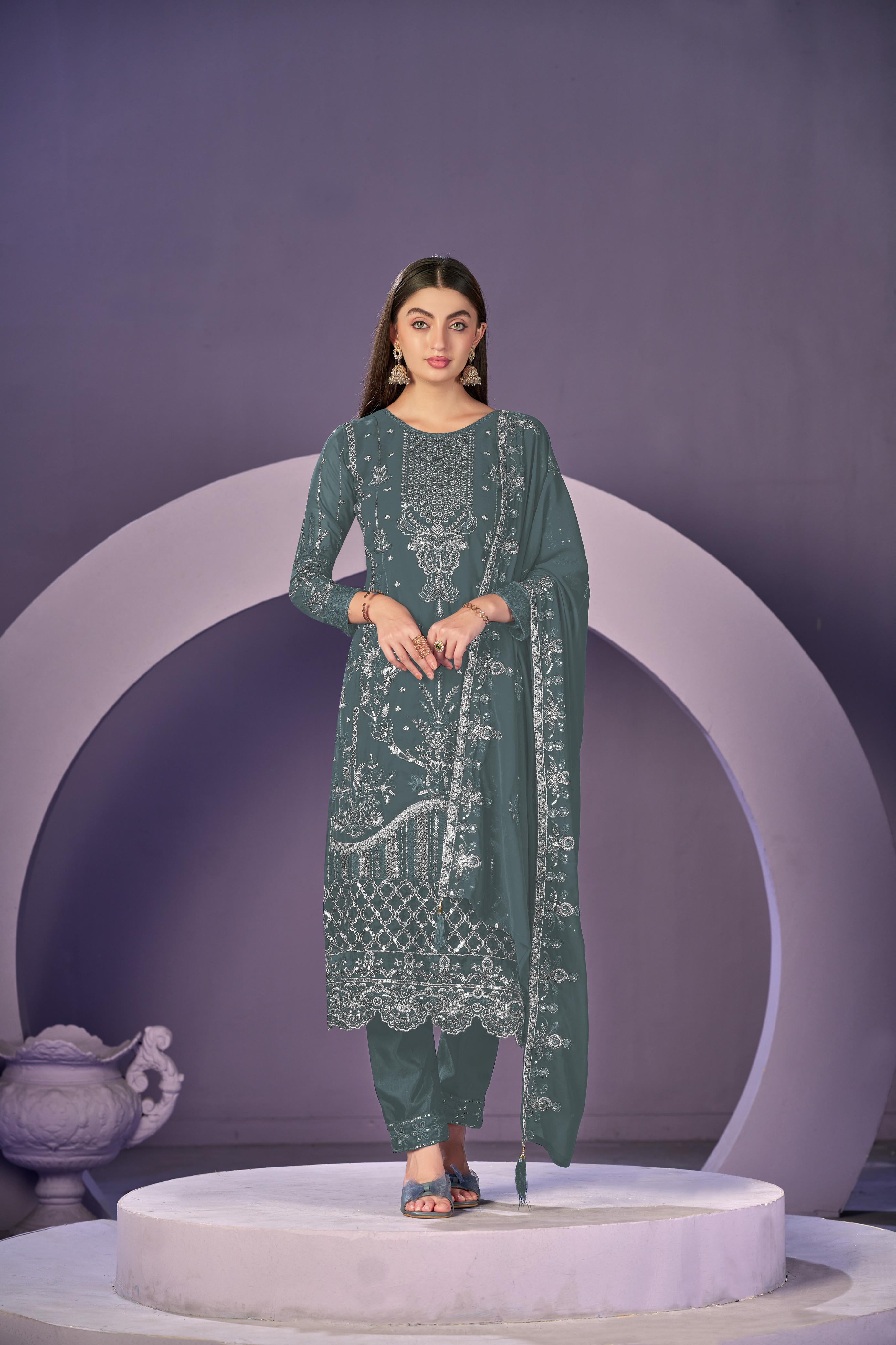 Sea green heavy georgette embroidered semi stitched suit with khatli work