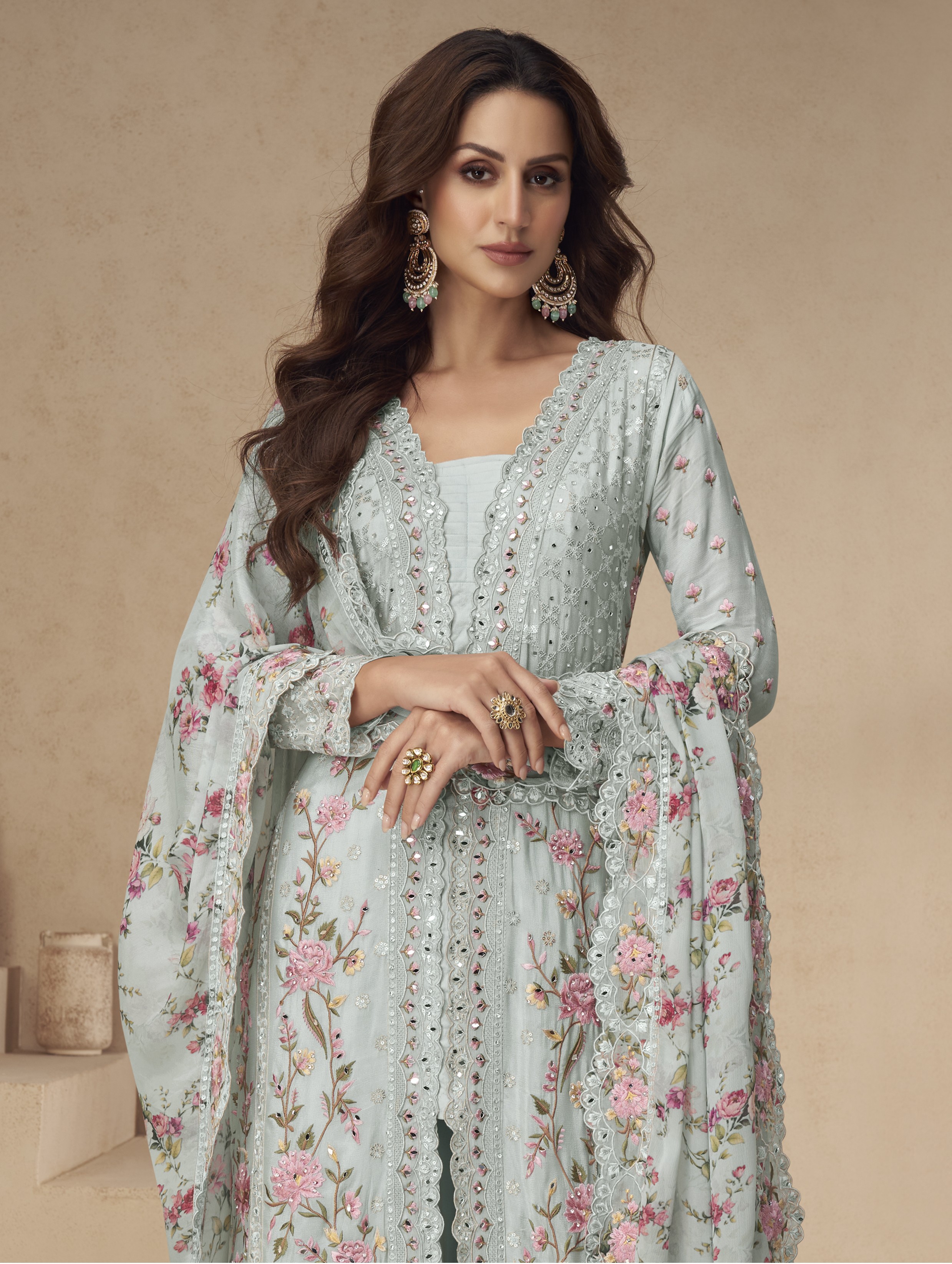 Sky-Blue Chinon Readymade Suit with Embroidery Sequence Work