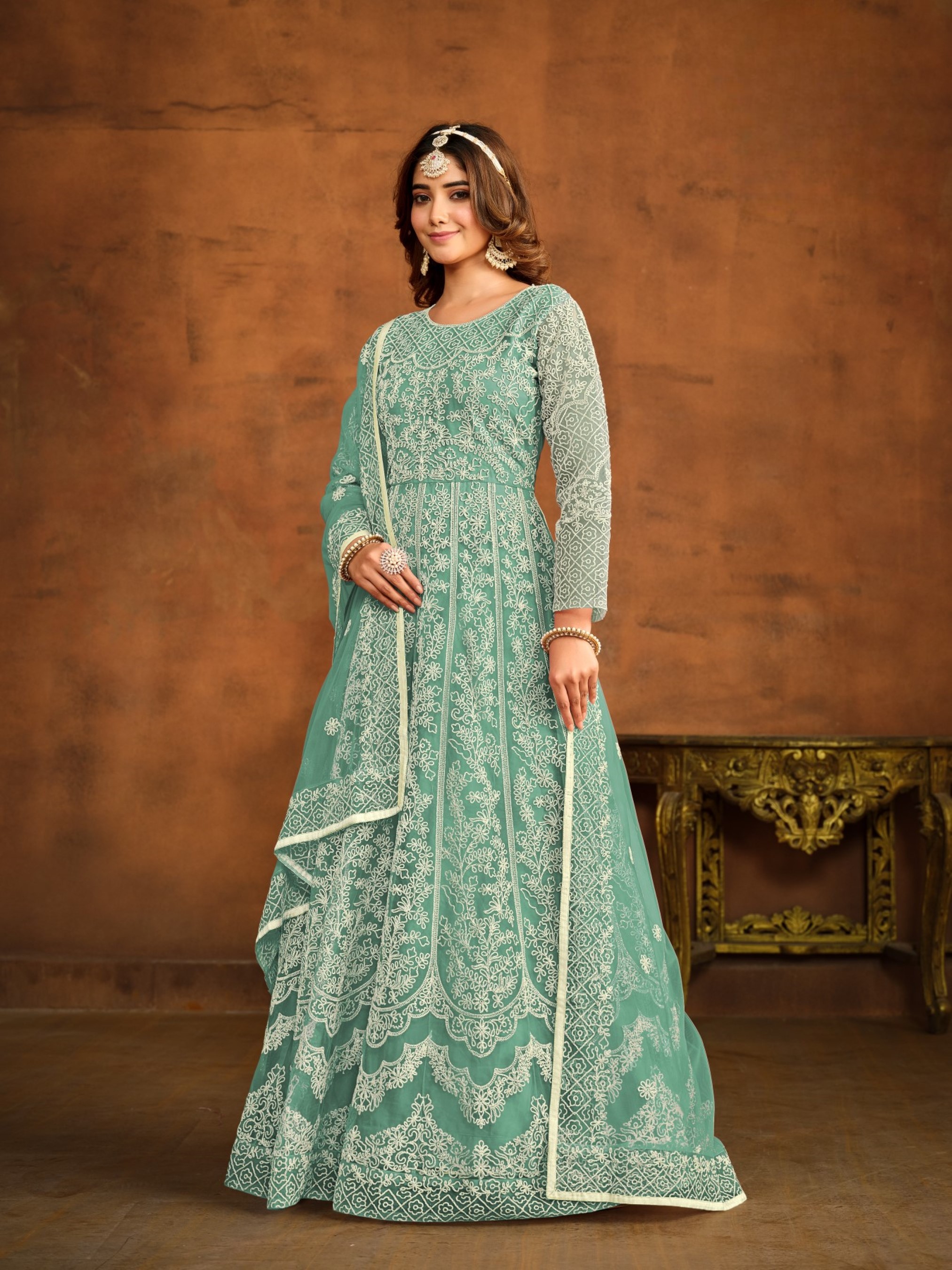 Sky Blue Embroidered Net Semi Stitched Anarkali Suit