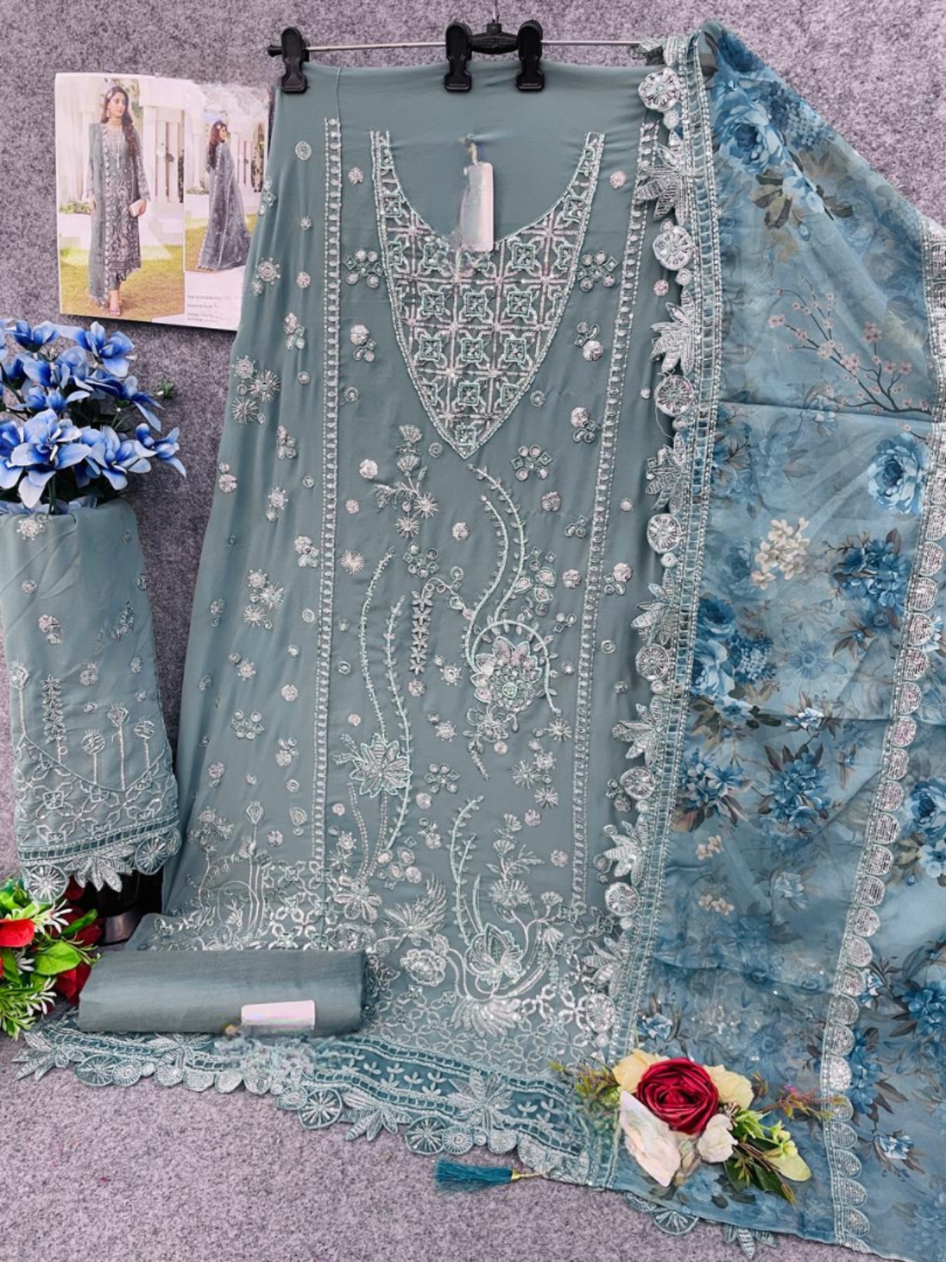 Sky Blue Faux Georgette Semi Stitched Suit with Embroidery Work