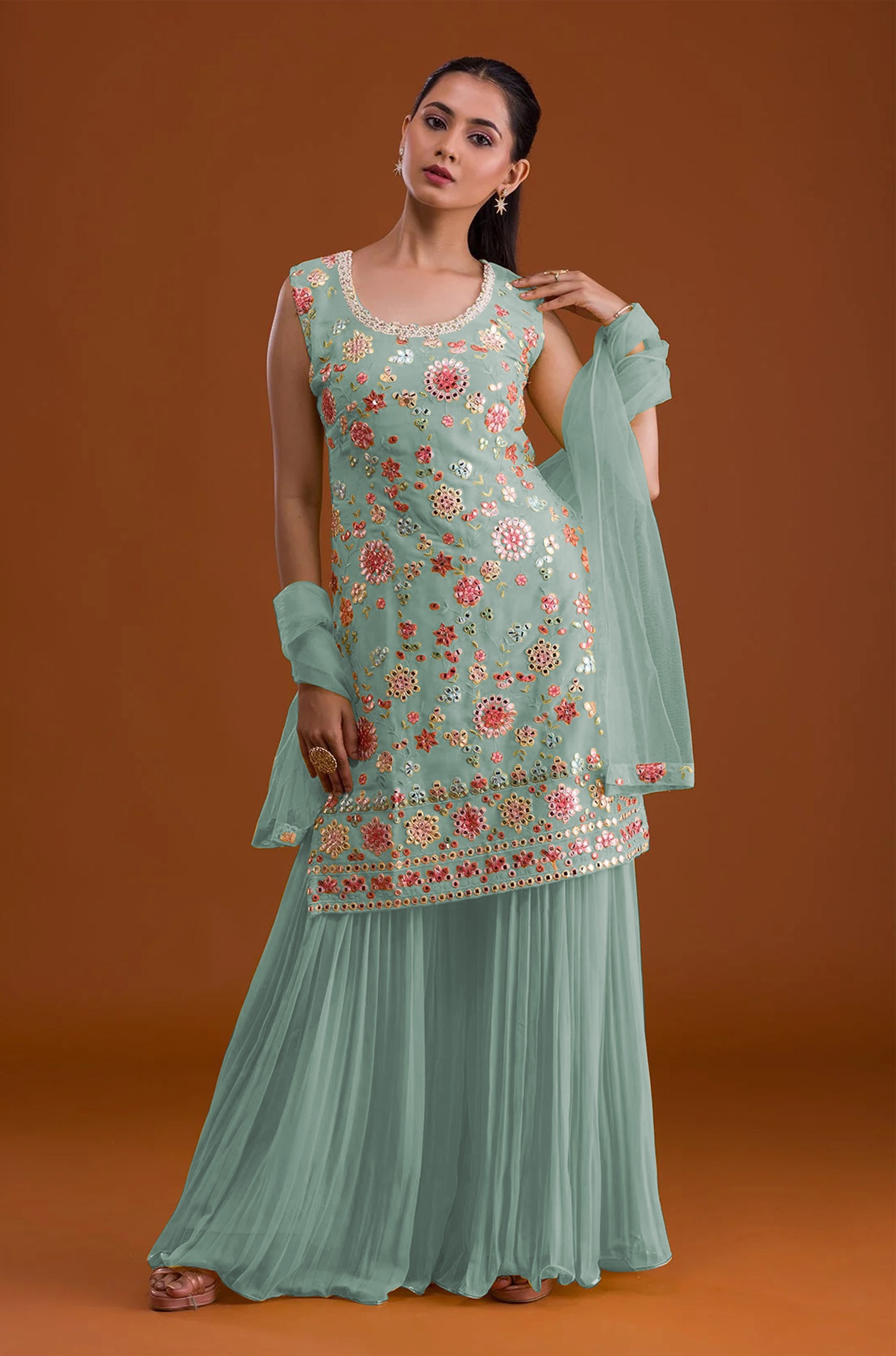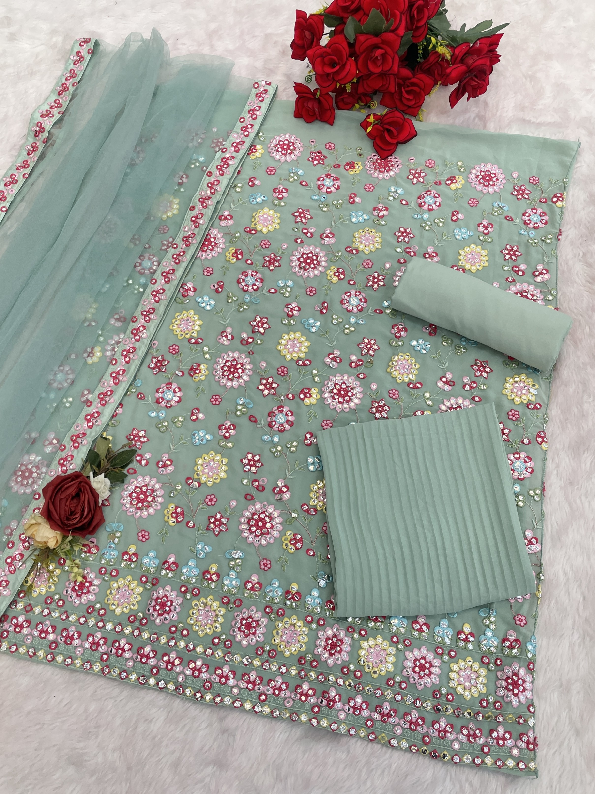 Sky Blue Georgette Semi Stitched Suit with Embroidered Multi Work