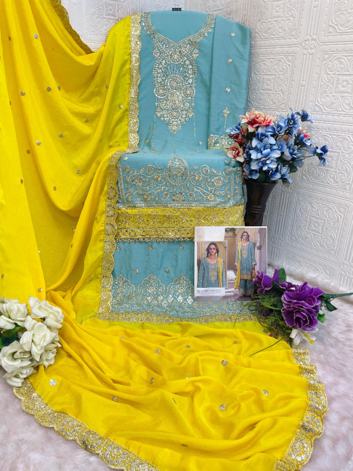 Sky Blue Heavy Chinon Semi Stitched Suit With Embroidery Bits Work