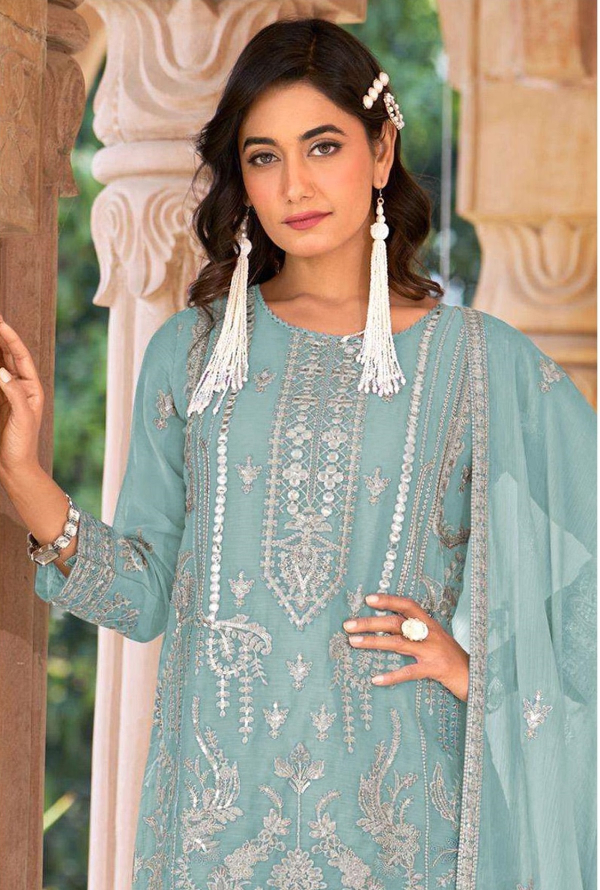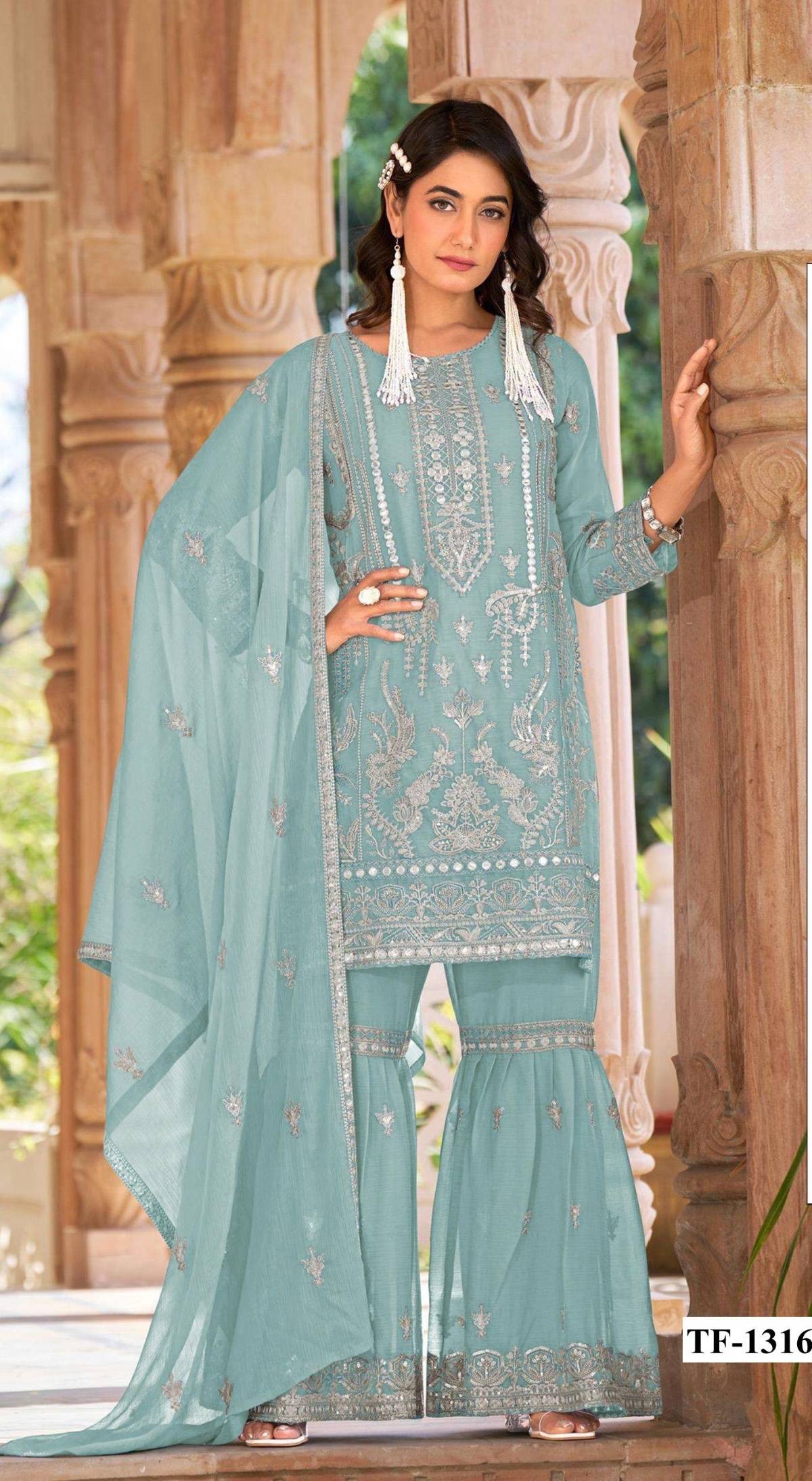 Sky Blue Naylon Organza Semi Stitched Suit With Embroidery & Mirror Work