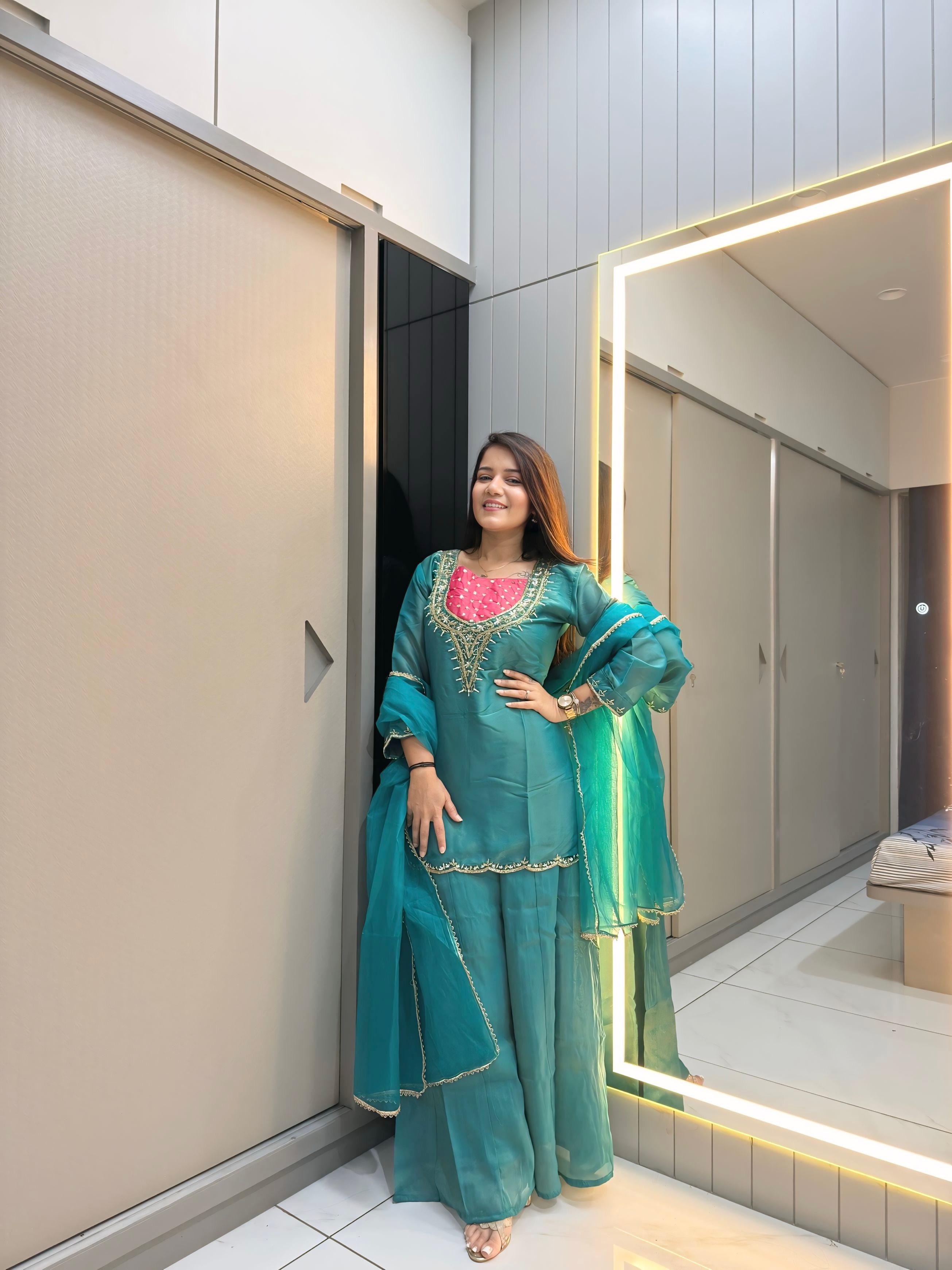 Sky-Blue Roman Shimmer Readymade Kurti Set with Handwork & Moti Work