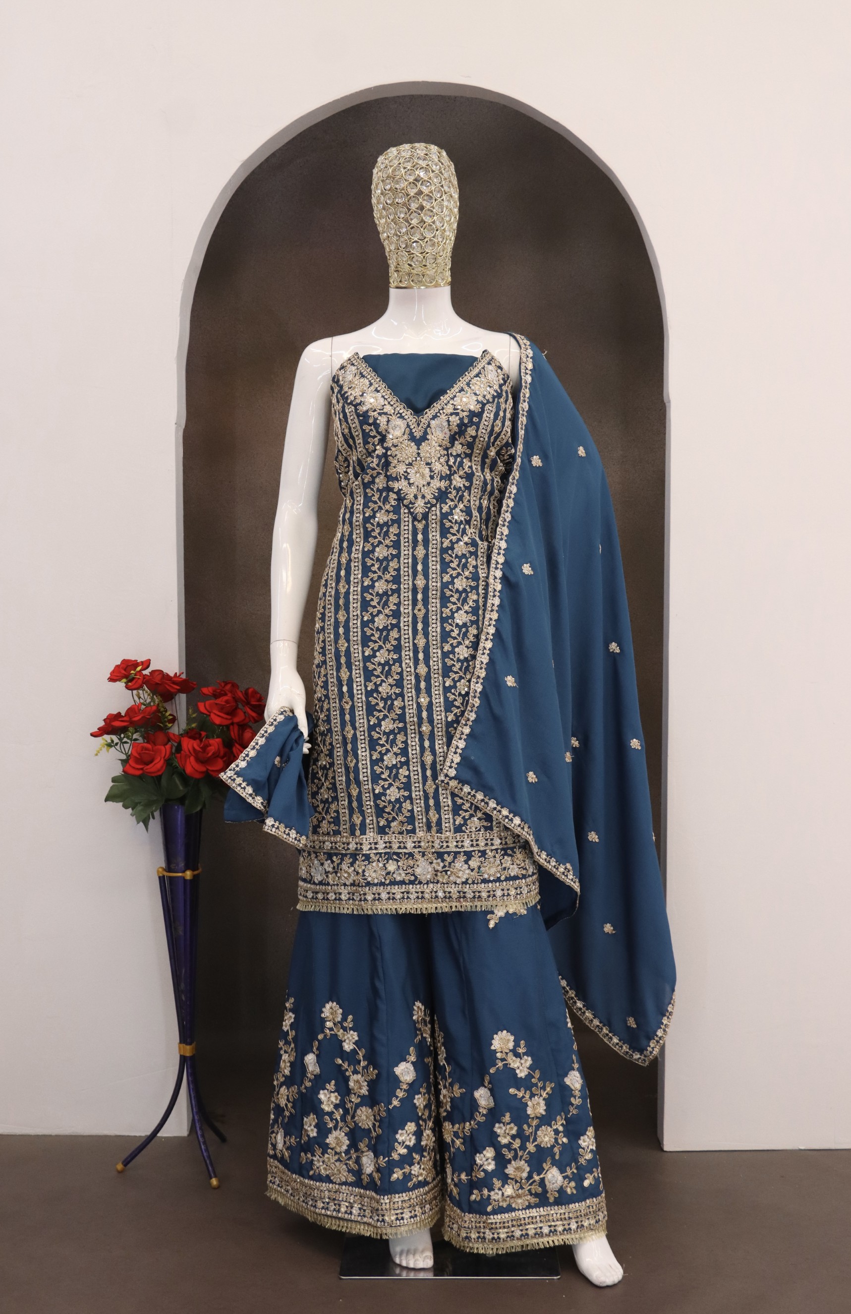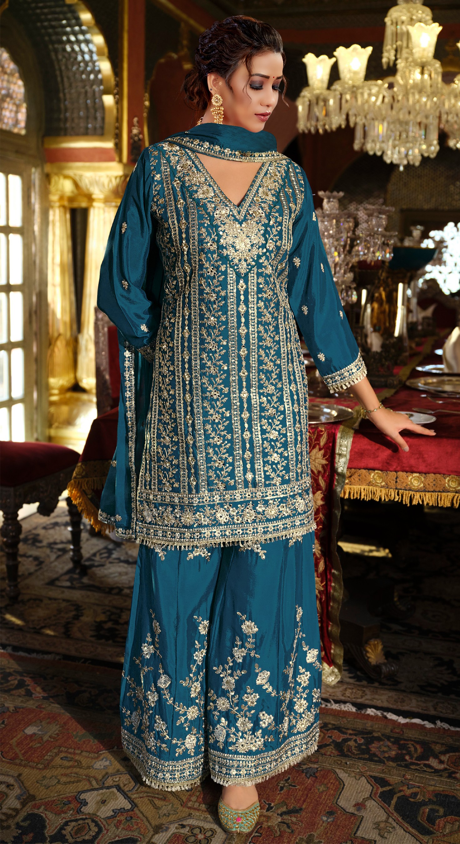 Teal Blue Chinon Semi Stitched Suit with Embroidery Codding Sequence Work