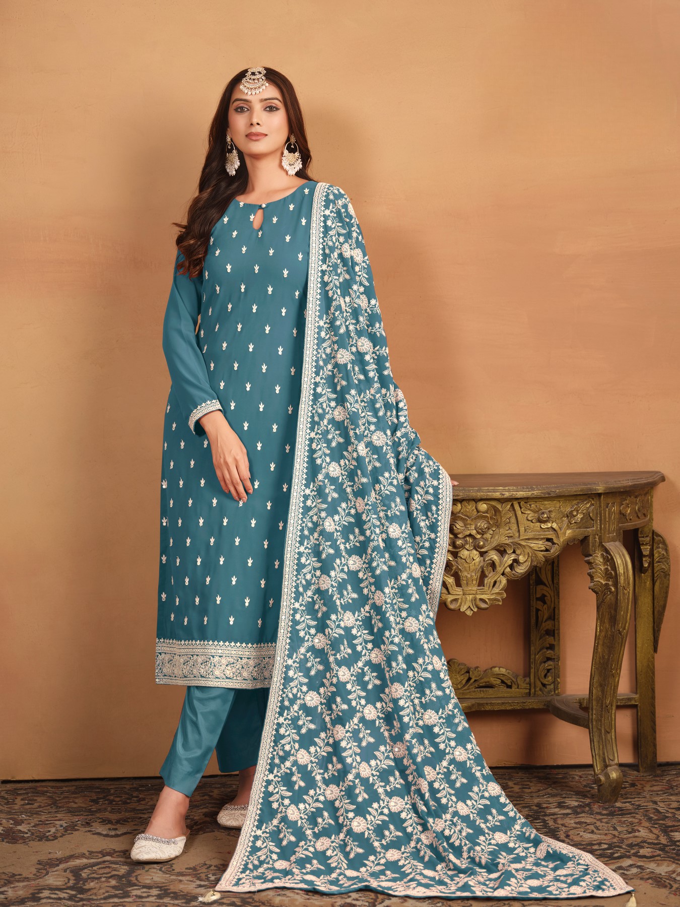 Teal Embroidered Faux Georgette Semi Stitched Salwar Suit