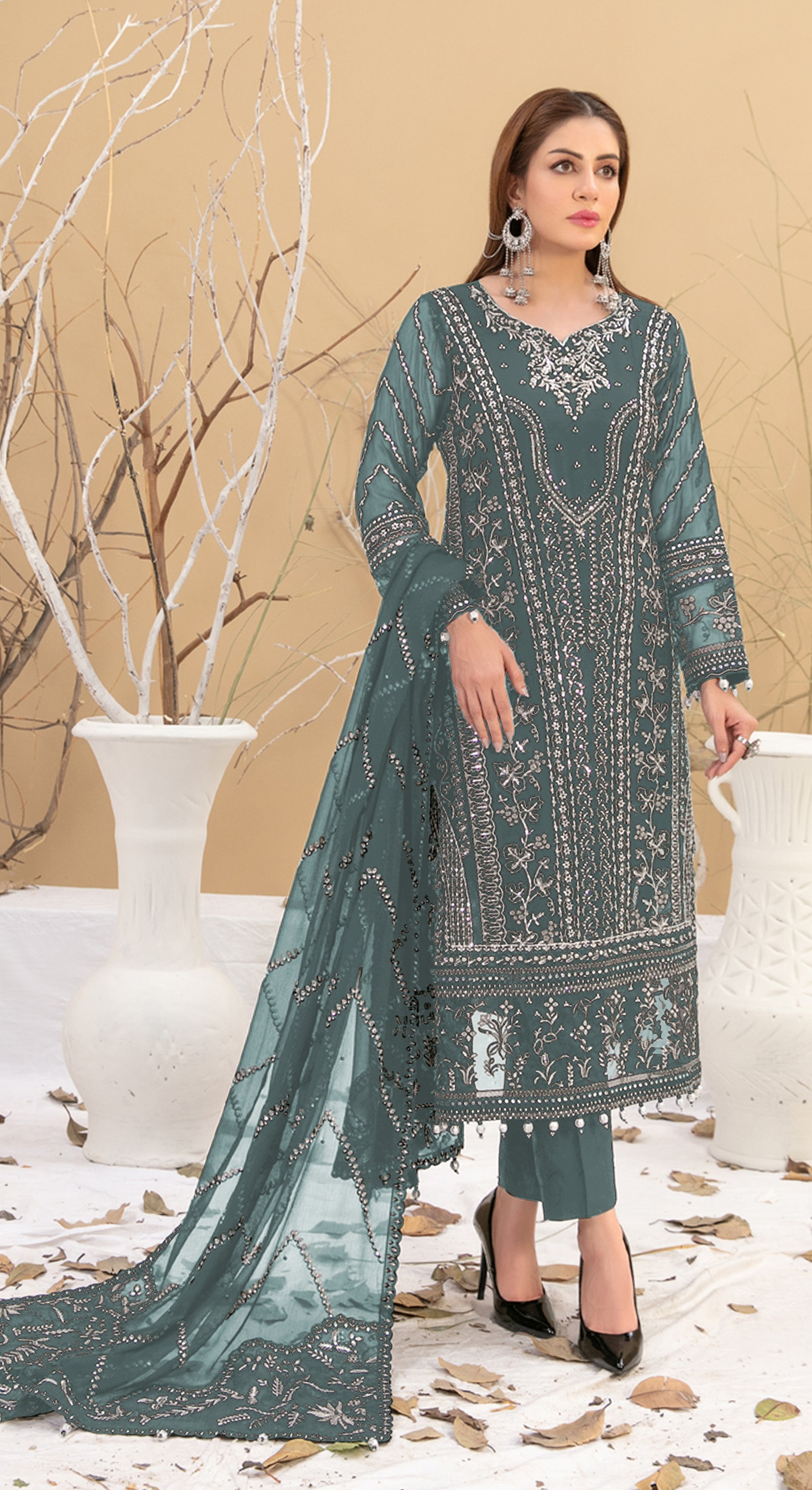 Teal Embroidered Faux Georgette Semi Stitched Salwar Suit