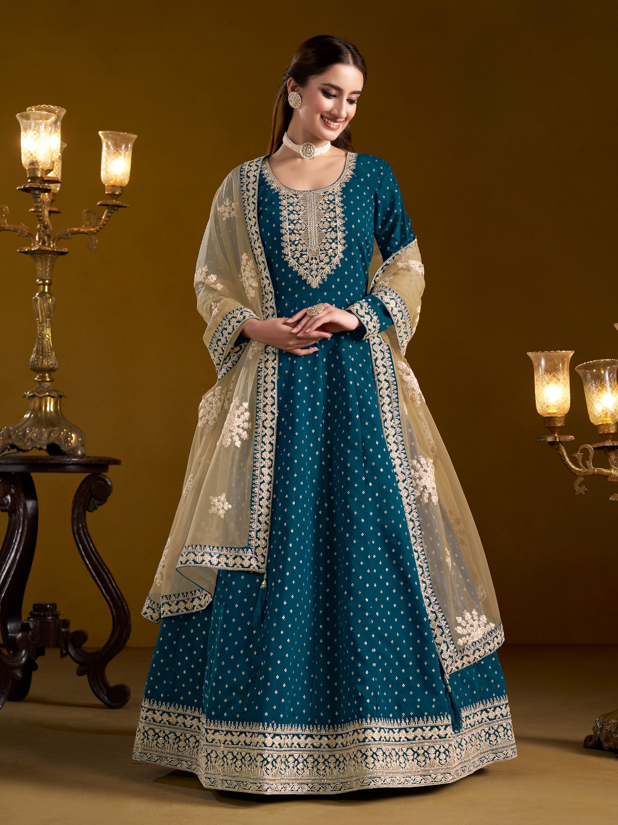 Teal Embroidered Jacquard Chanderi Semi Stitched Anarkali Suit