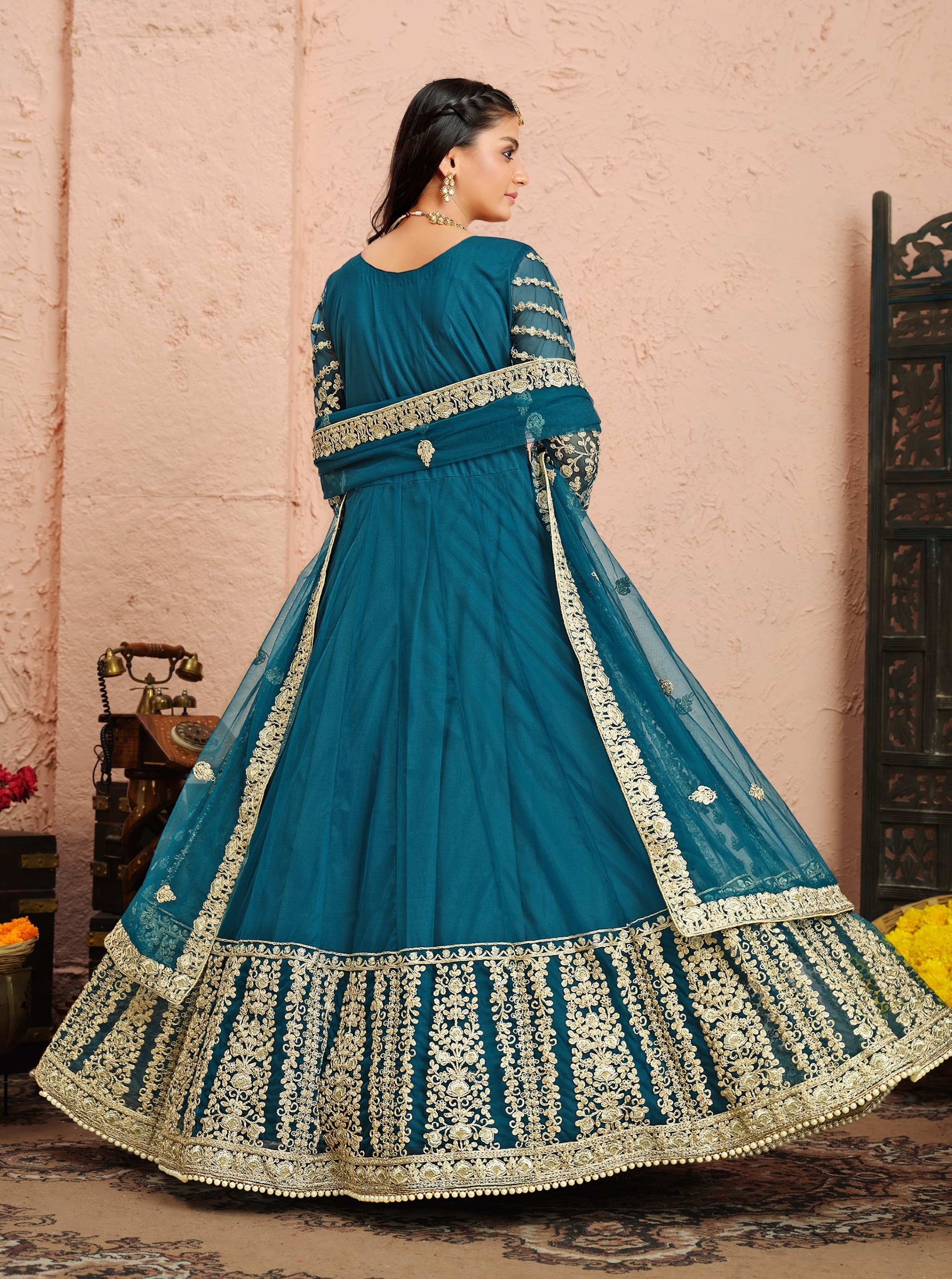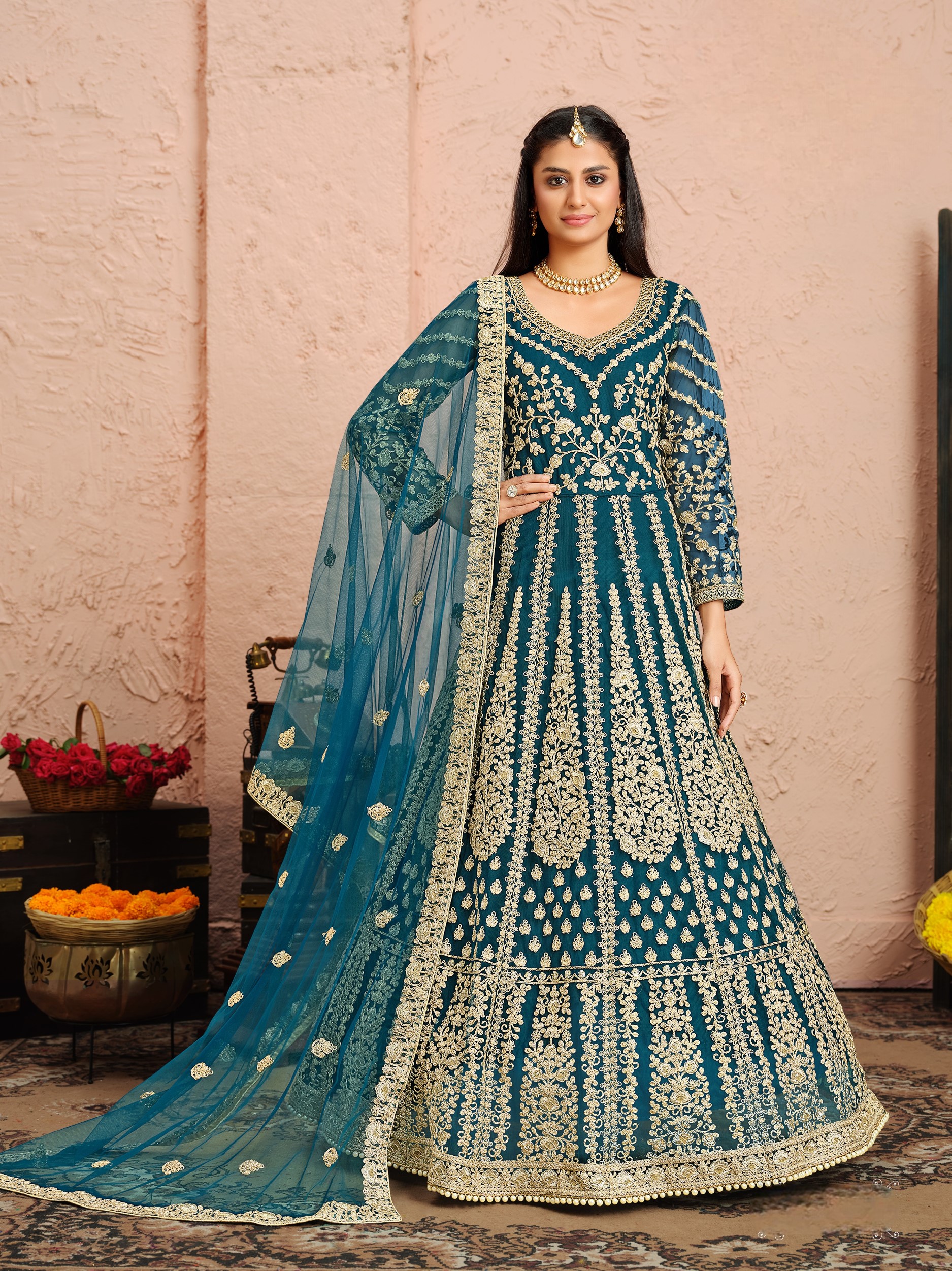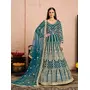 Teal Embroidered Net Semi Stitched Anarkali Suit