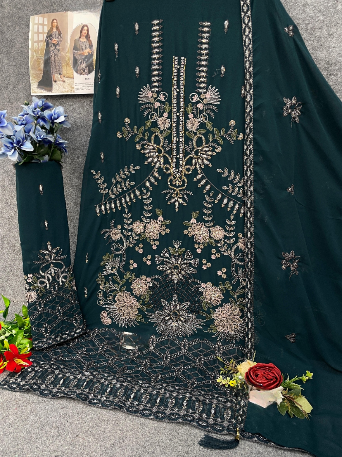 Teal Faux Georgette Semi Stitched Suit with Embroidery Work