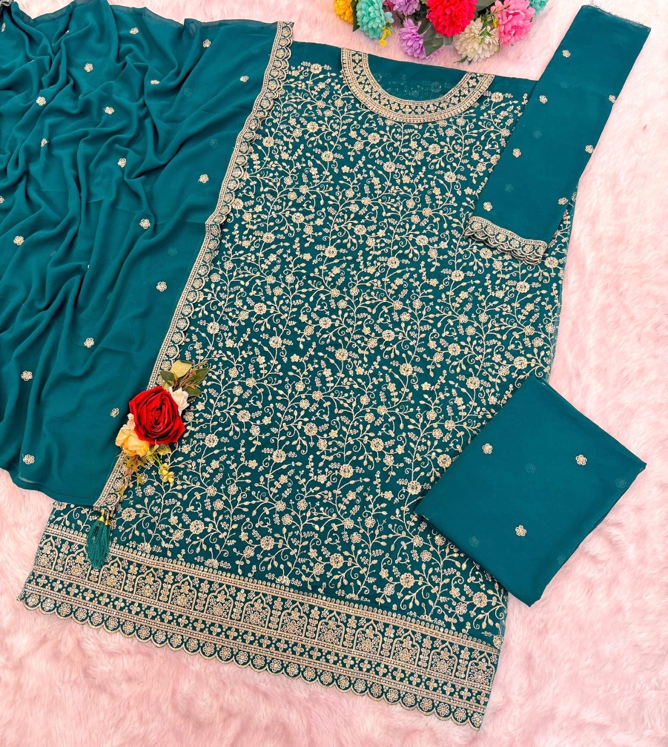 Teal green Blooming Georgette Semi Stitched suit with Heavy Embroidery & Sequence work