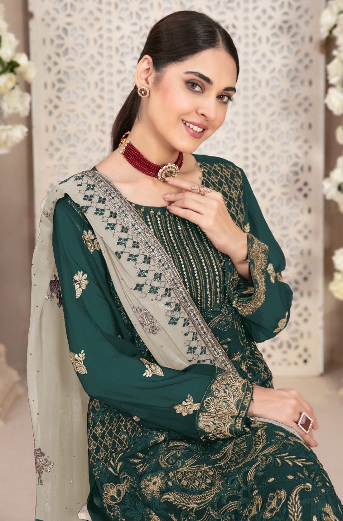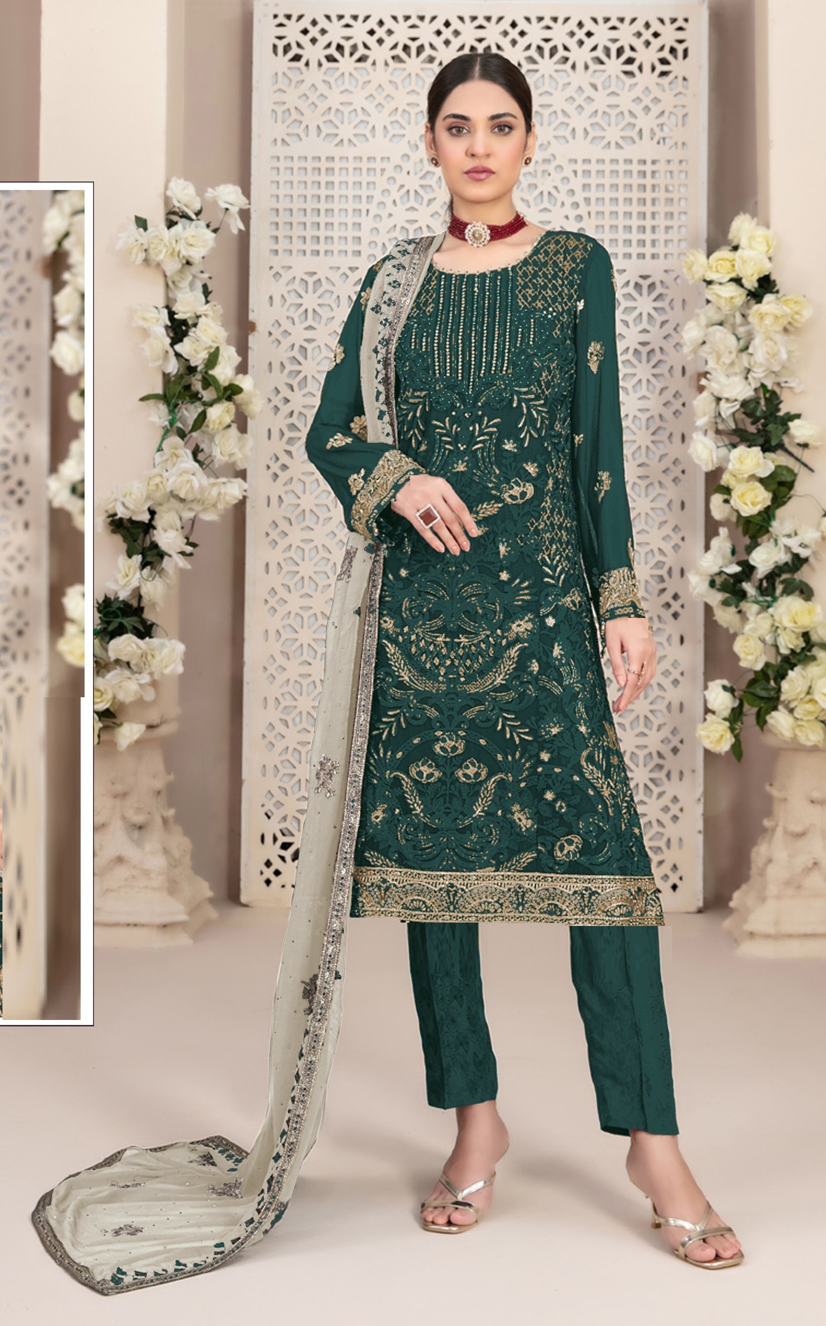 Teal Green Embroidered Faux Georgette Semi Stitched Salwar Suit