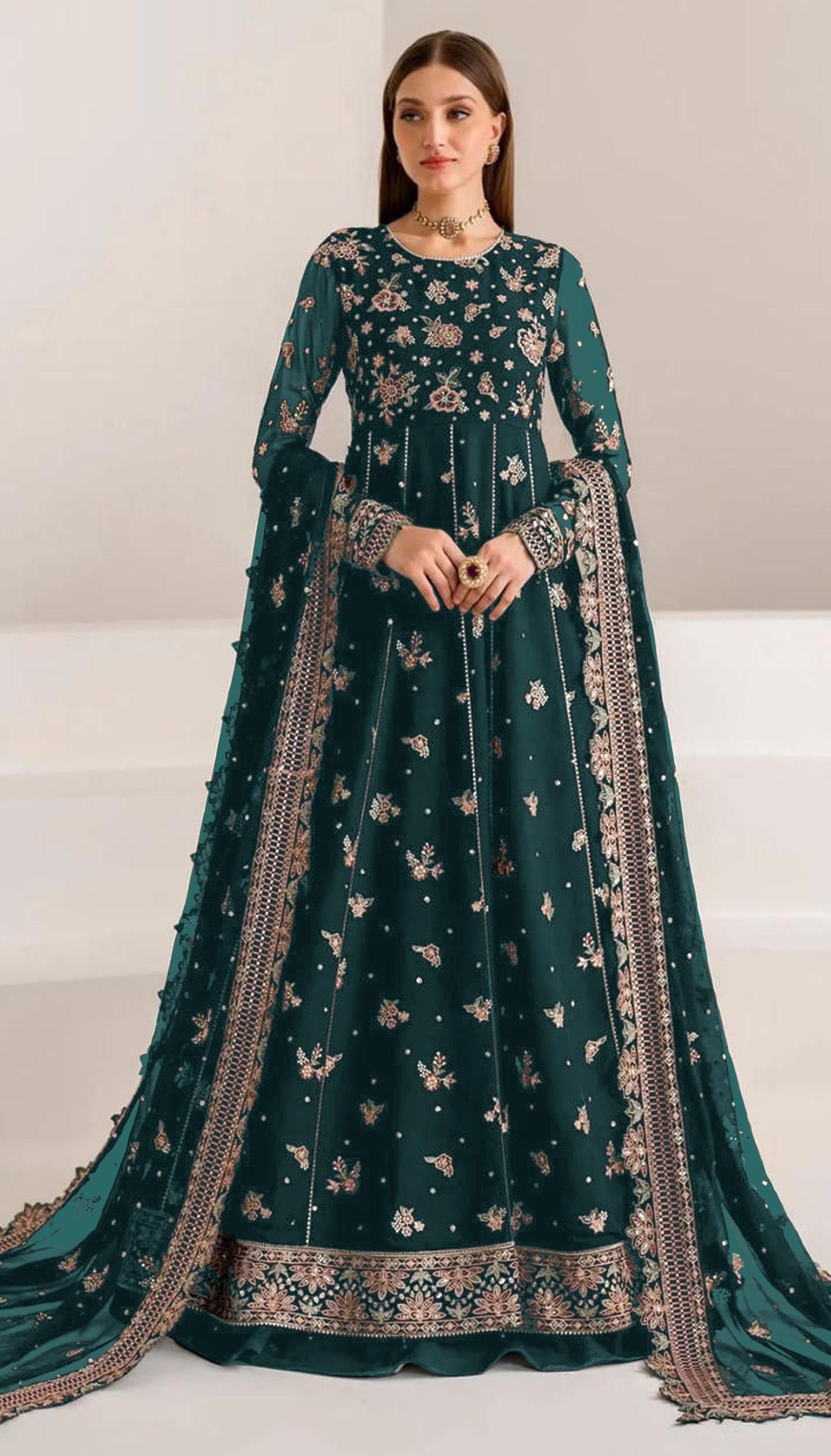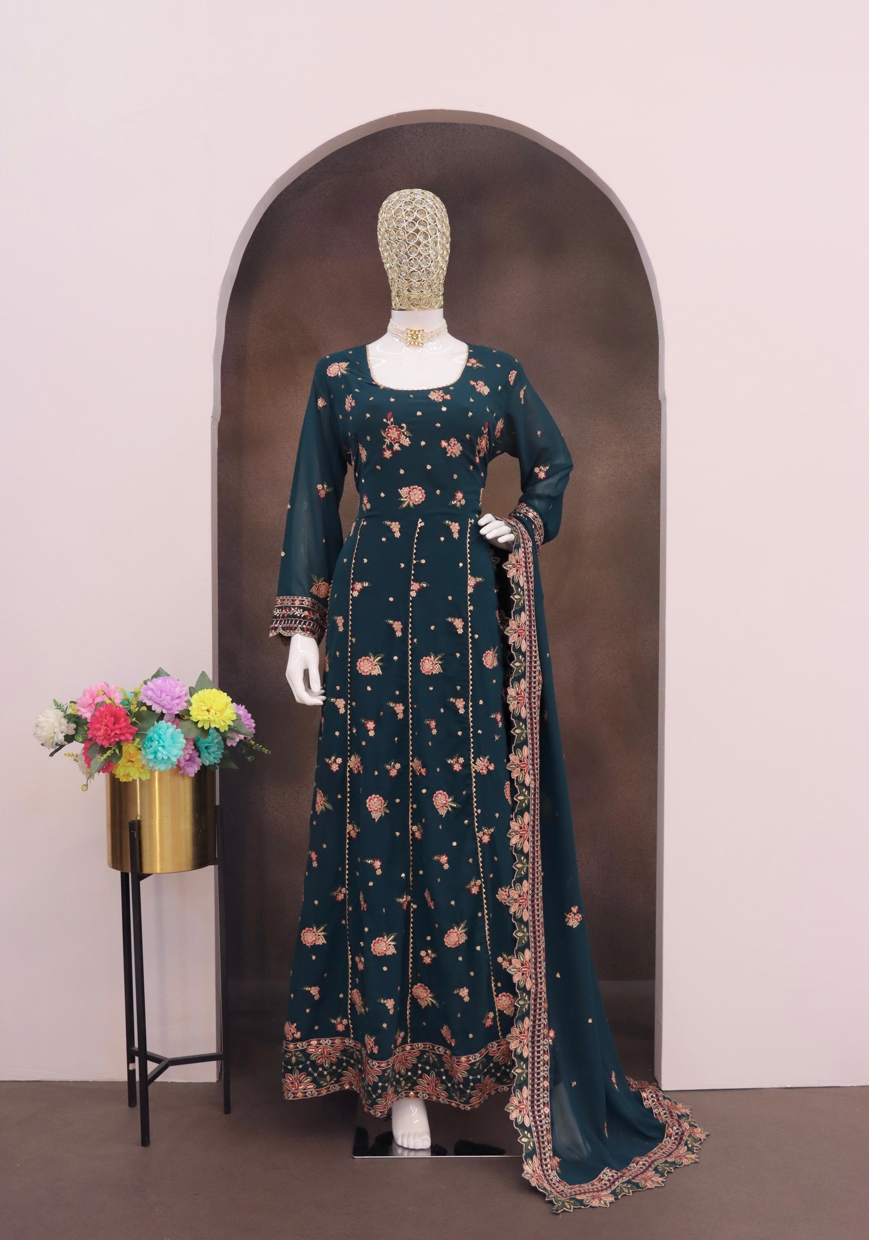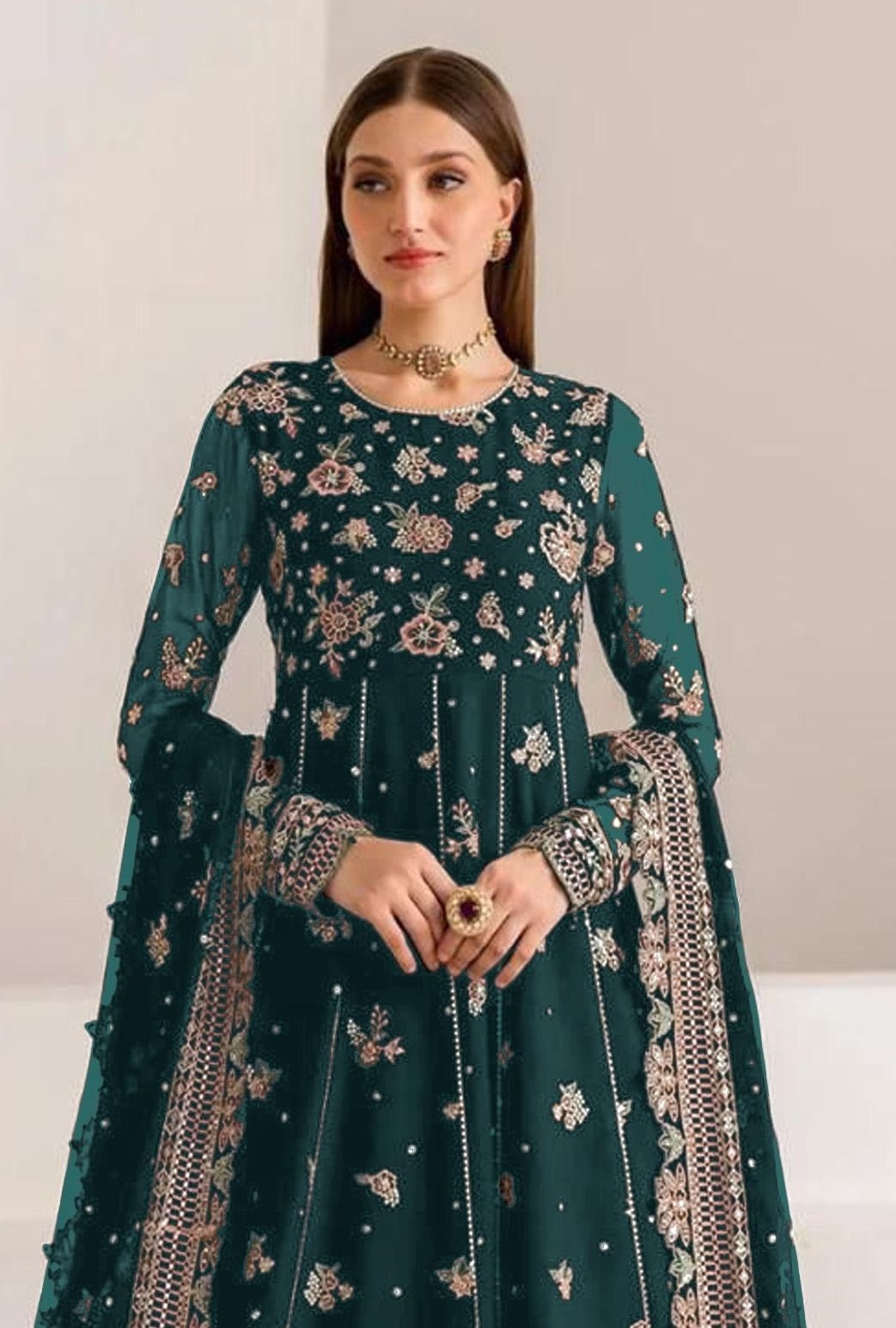 Teal Green Fauk Gerogette Sequence Embroidered Semi Stitched Salwar Suit