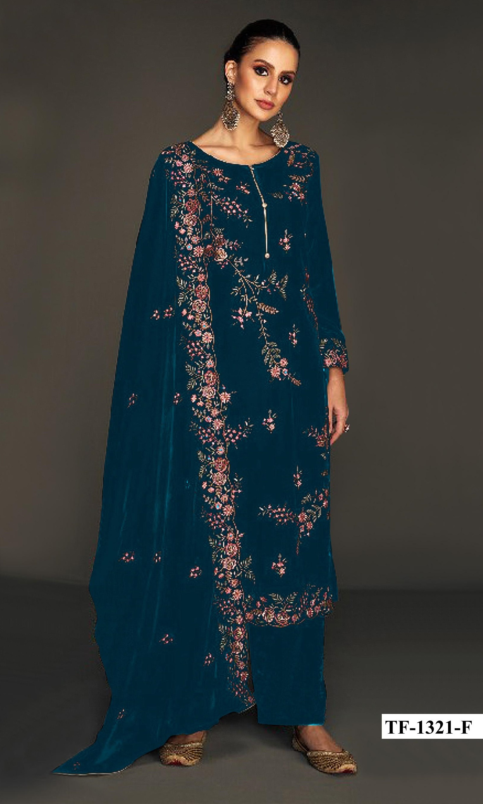 Teal Pure Velvet Semi Stitched Suit with Heavy Embroidery Sequence Work