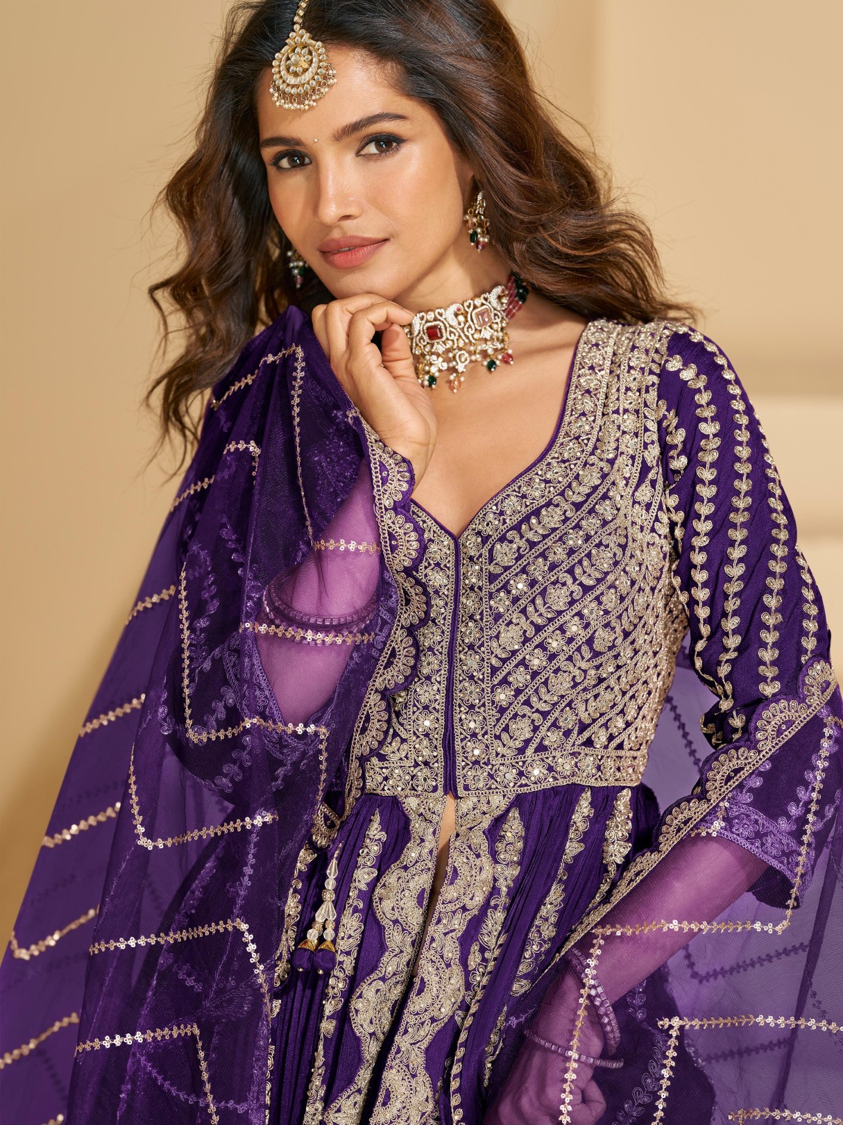 Violet Chinon Readymade Anarkali Lehenga with Heavy Embroidery Work