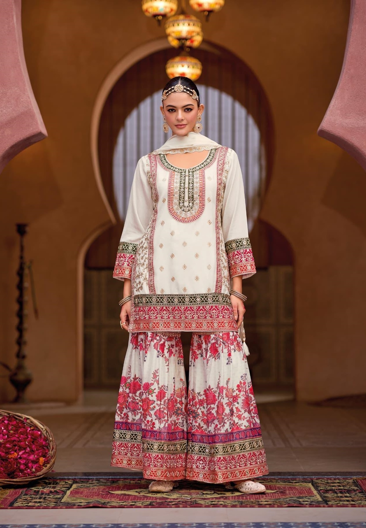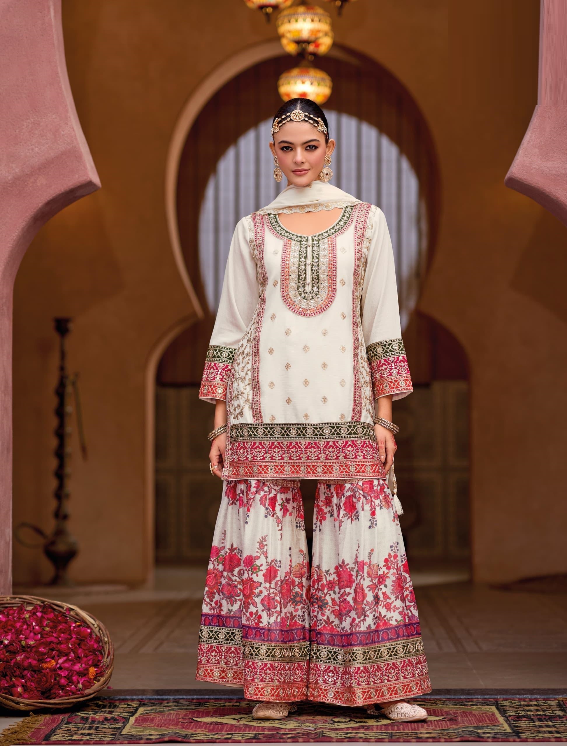 White Chinon Embroidered Readymade Salwar Suit (Free Size)