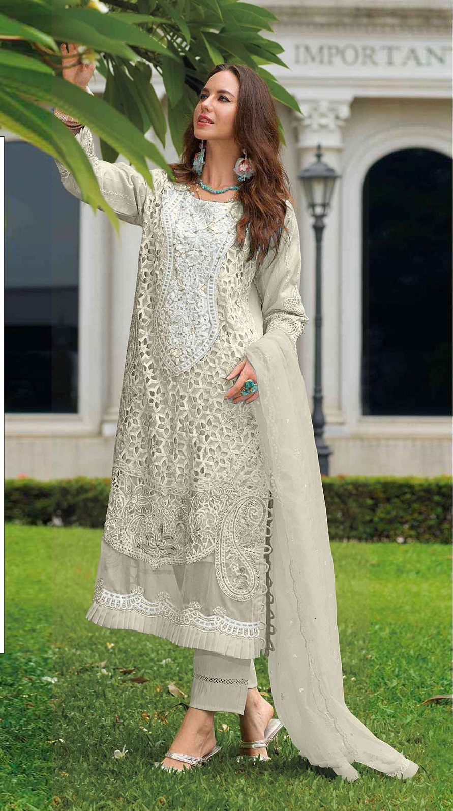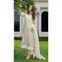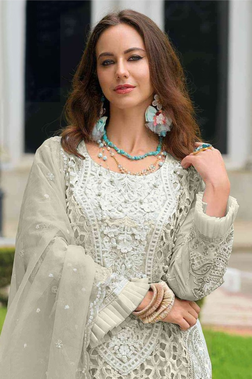 White embroidered sequence cut work heavy organza unstitched suit with moti & Frill