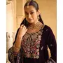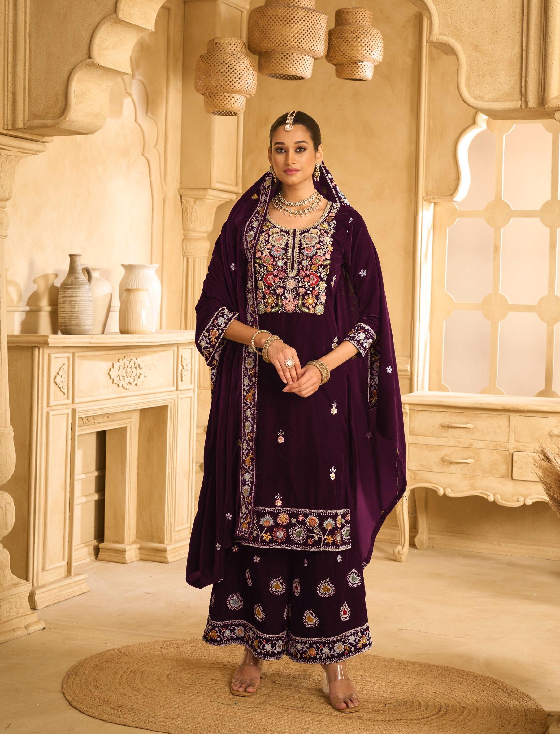 Wine Embroderied Velvet Semi-Stitched Plazo Suit