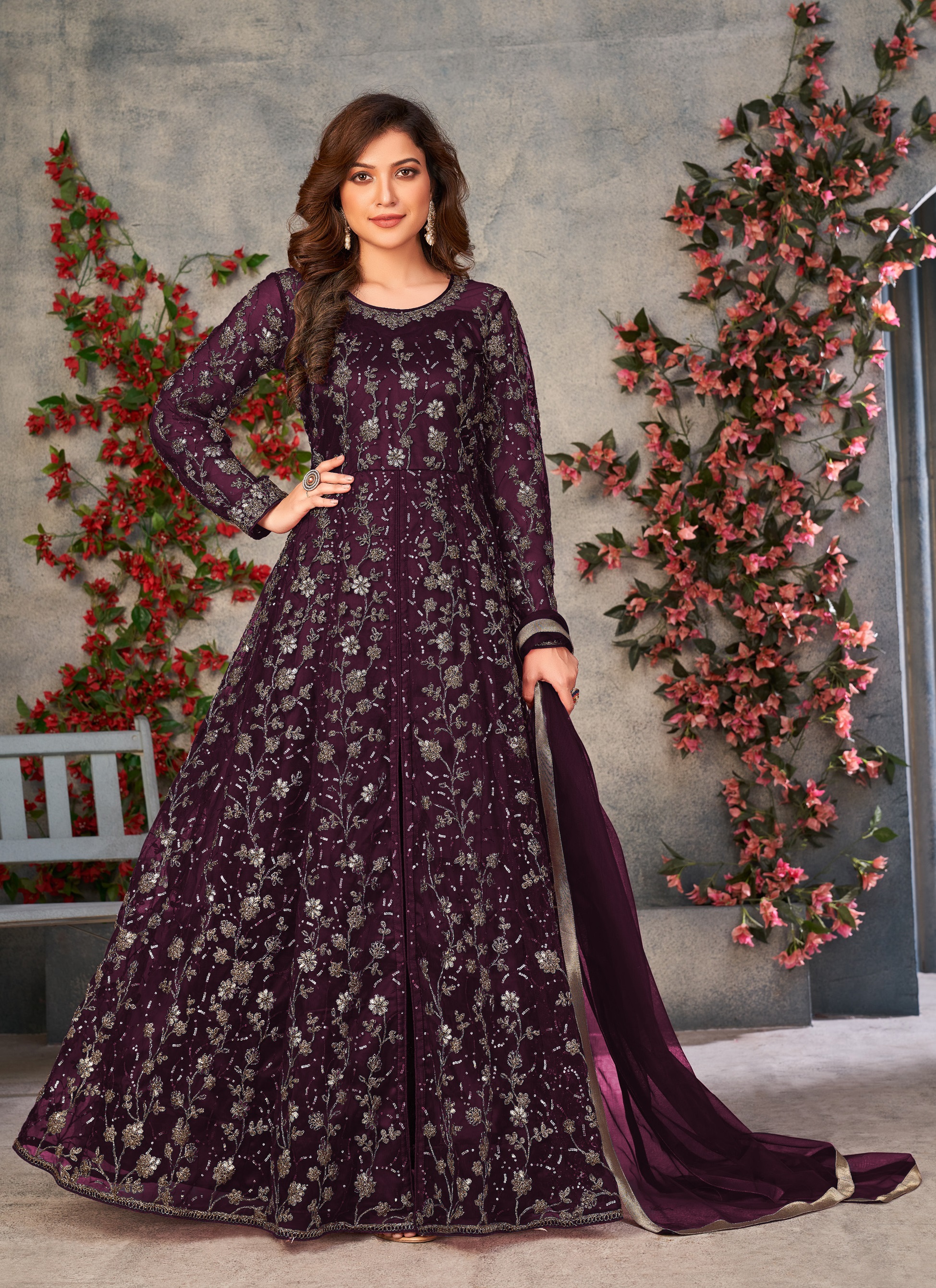 Wine Embroidered Butterfly Net Semi Stitched Anarkali Suit