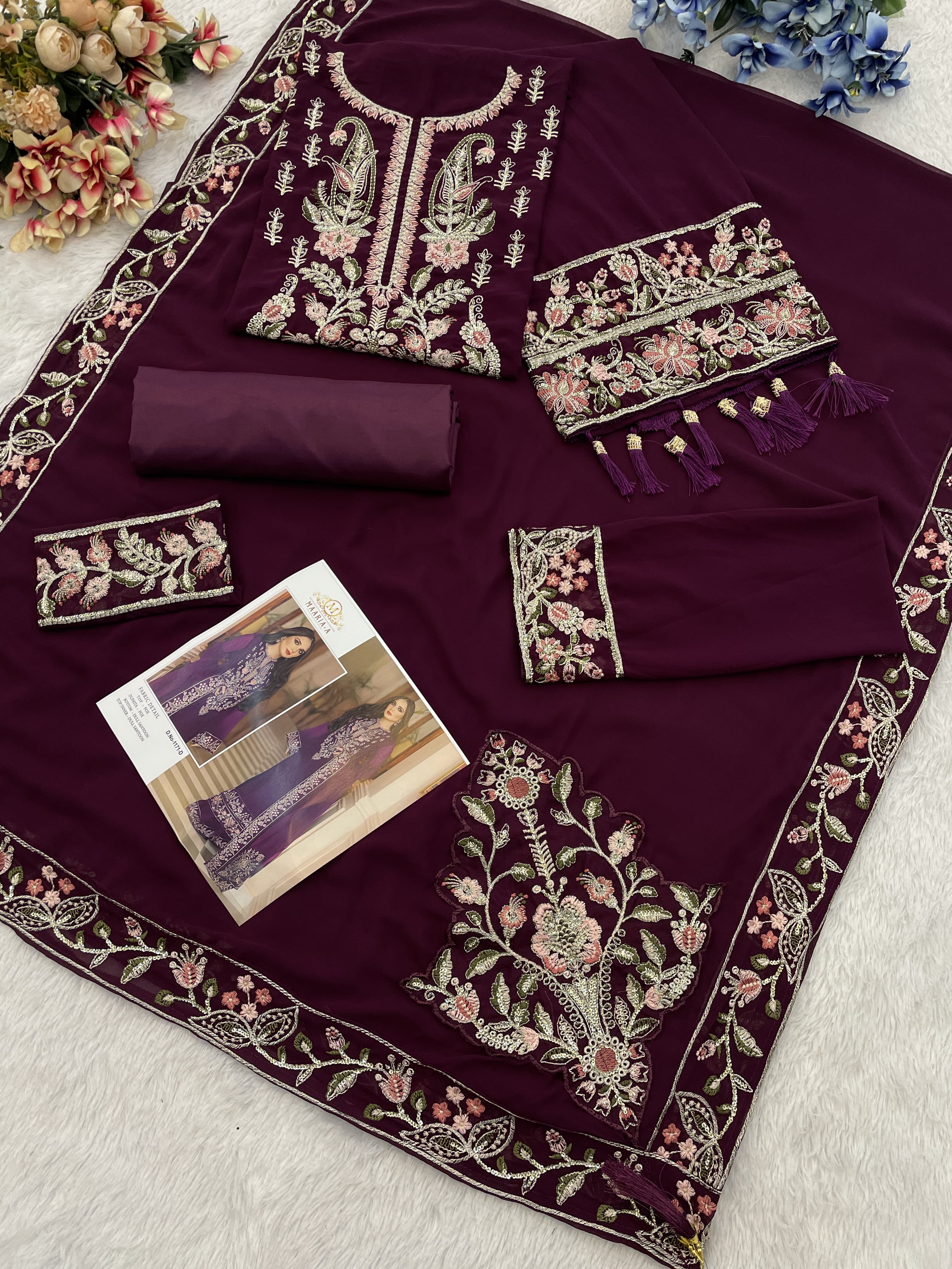 Wine Heavy Fox Georgette With Embroidery Work With Fancy Lace