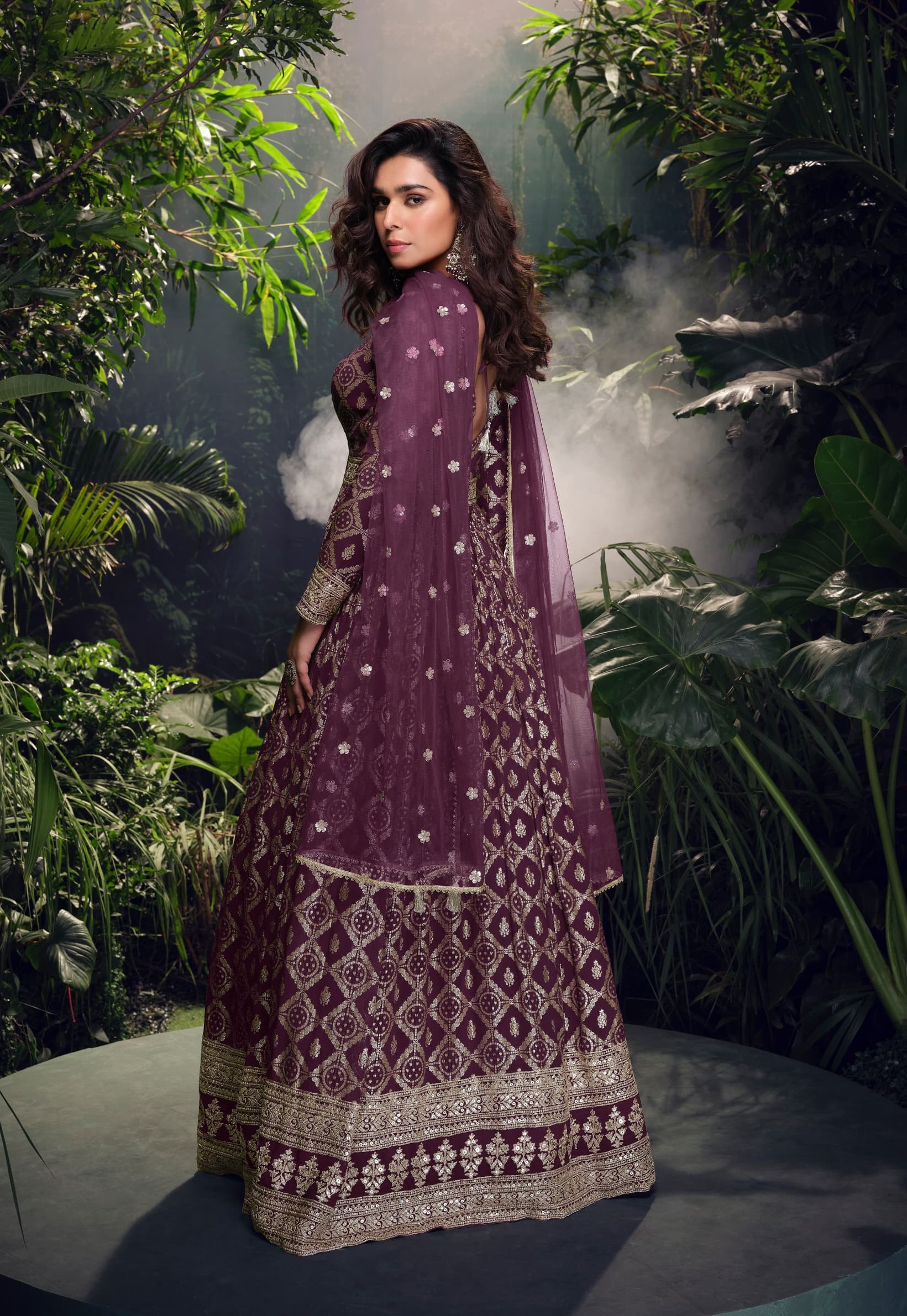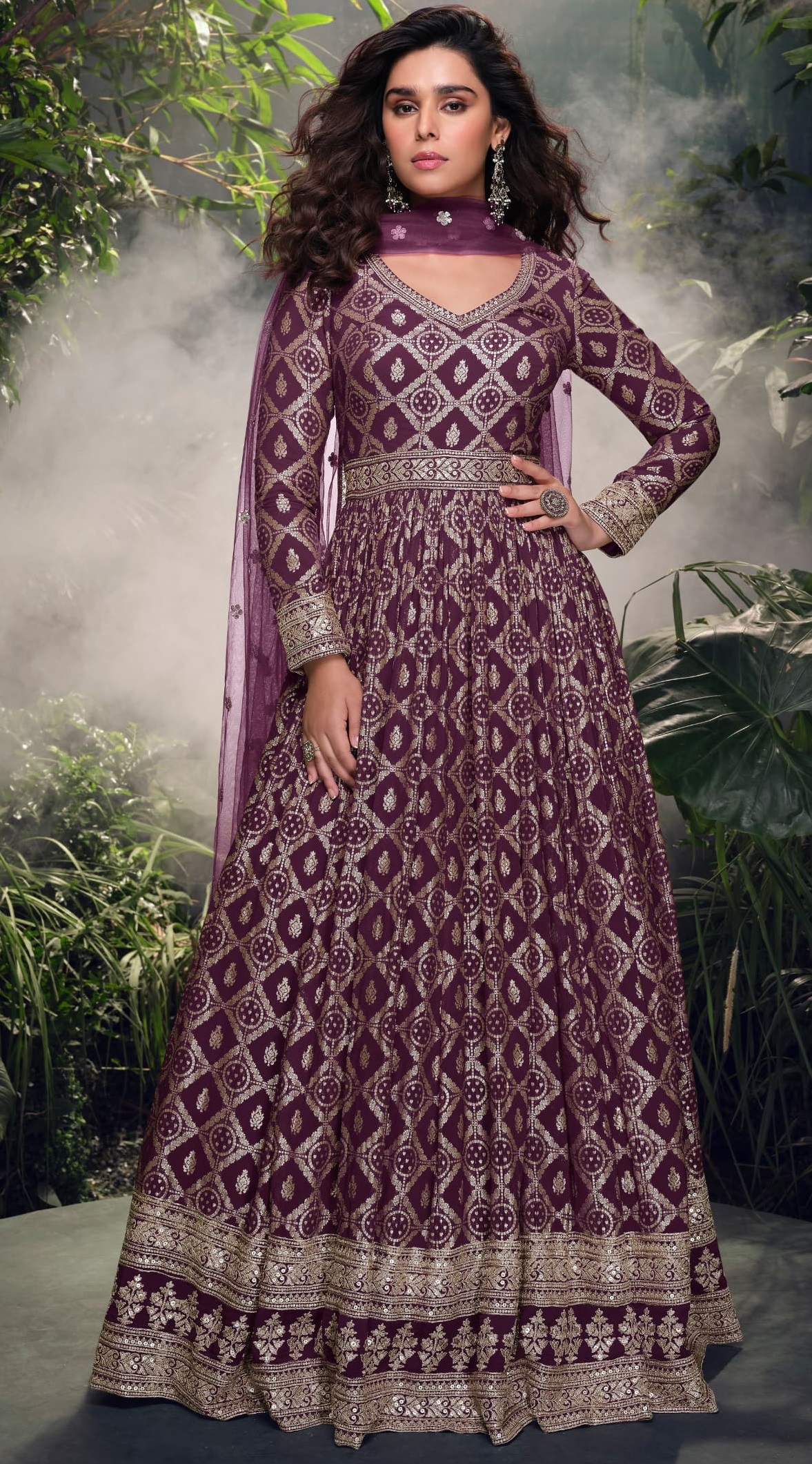 Wine Viscose Simar Jacquard Stiched Hand Made Khatli Work Anarkali Gown (Free Size)