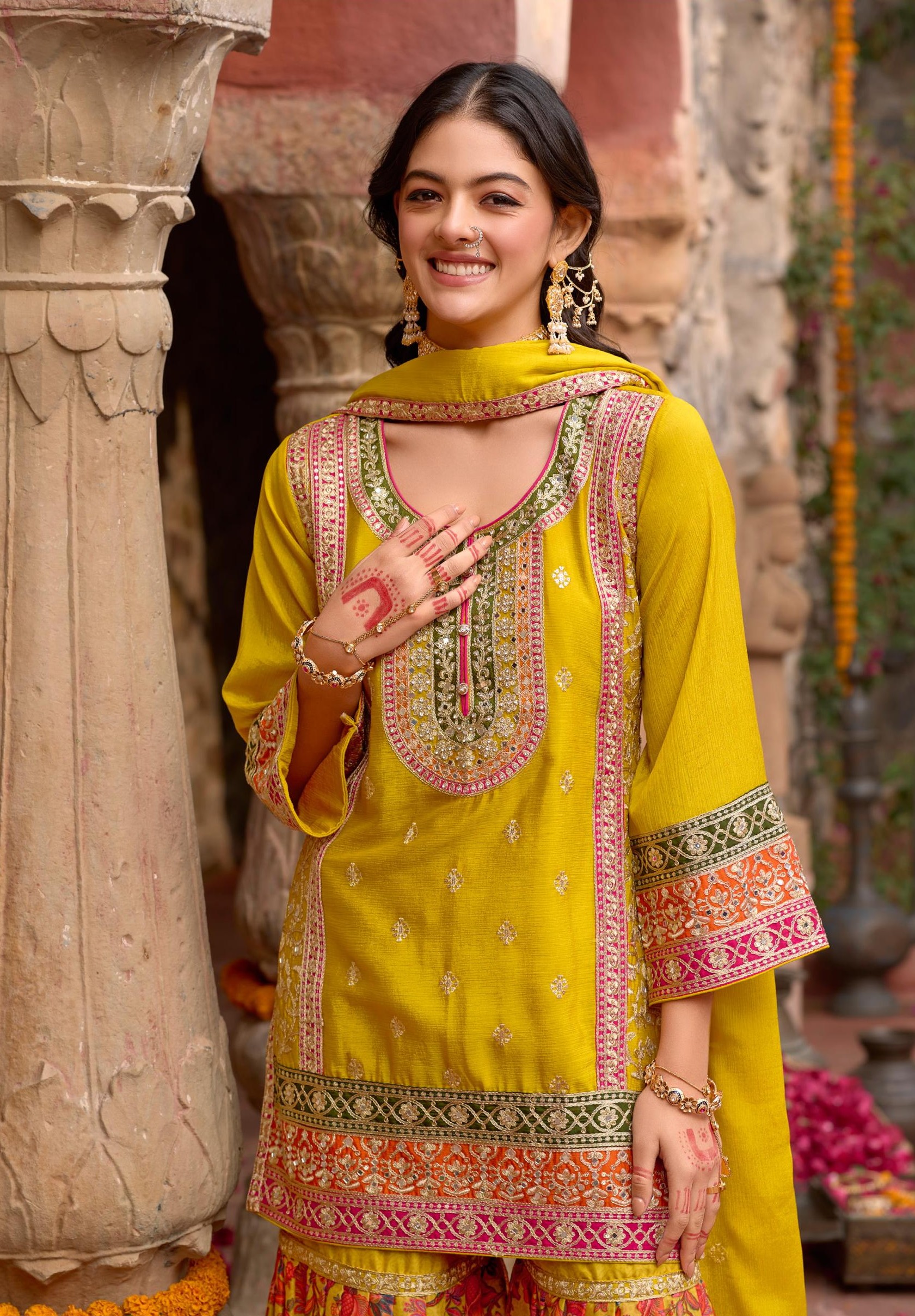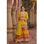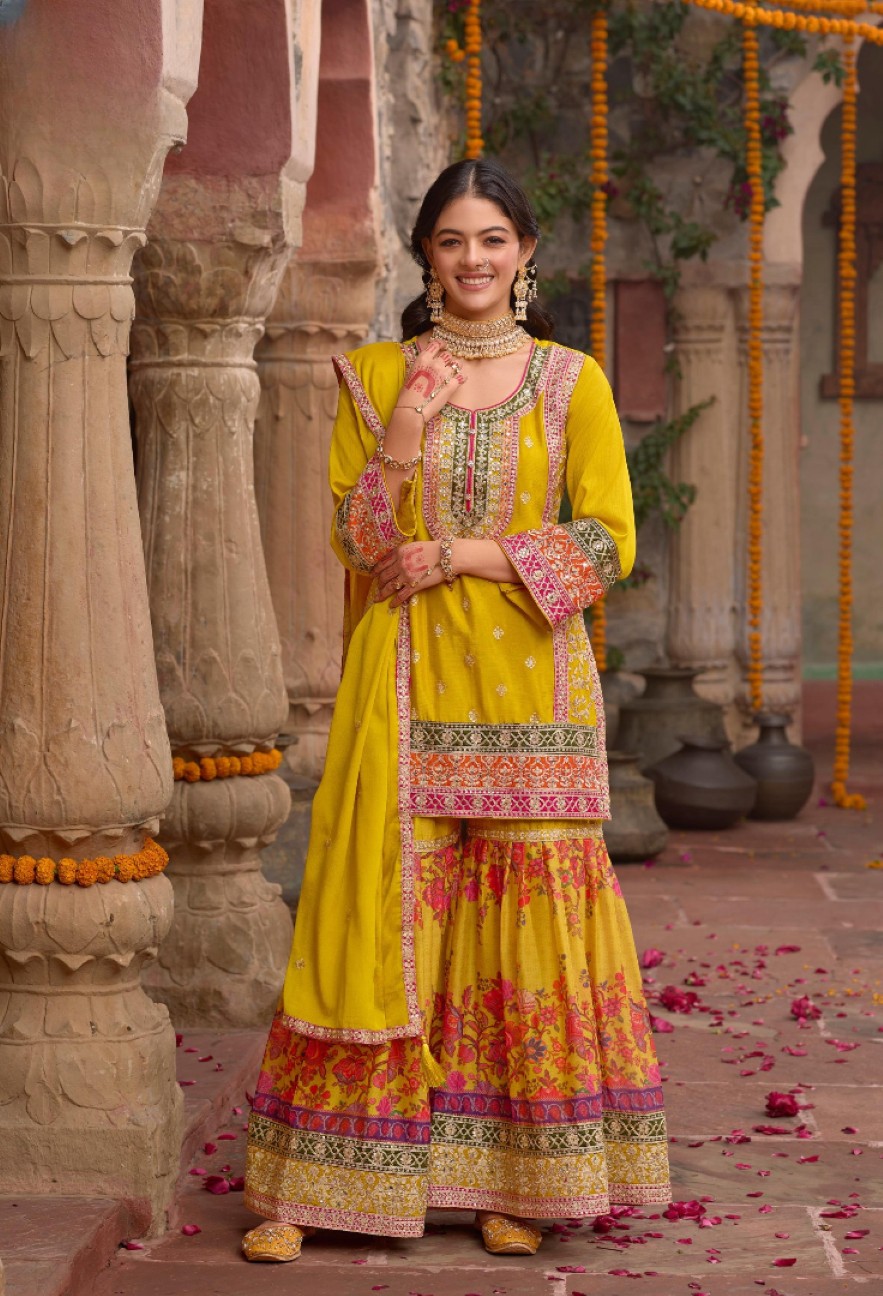 Yellow Chinon Readymade Palazzo Suit with Codding Dori & Sequence Work