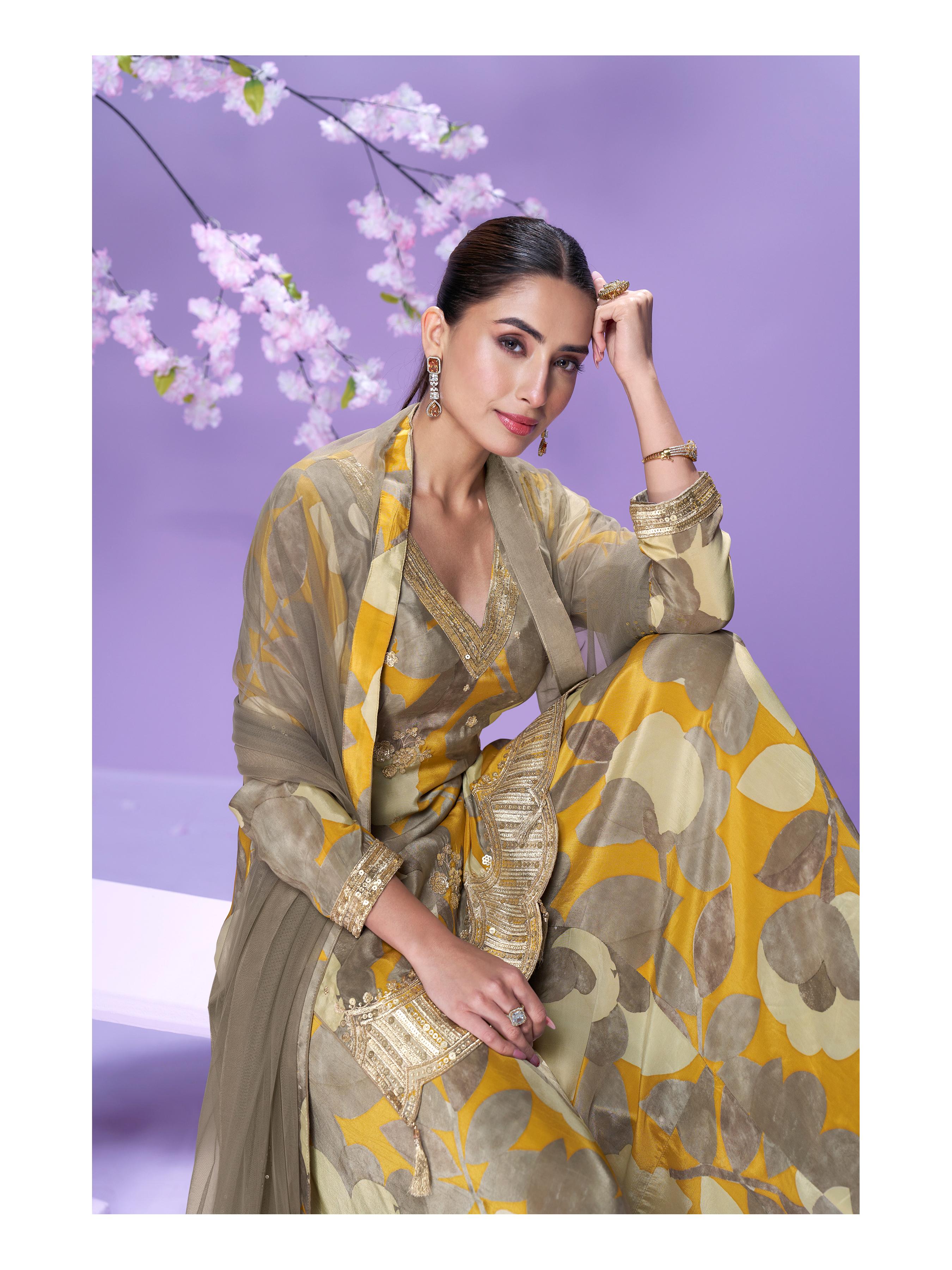 Yellow Chinon Readymade Plazzo Suit with Digital Embroidery Work