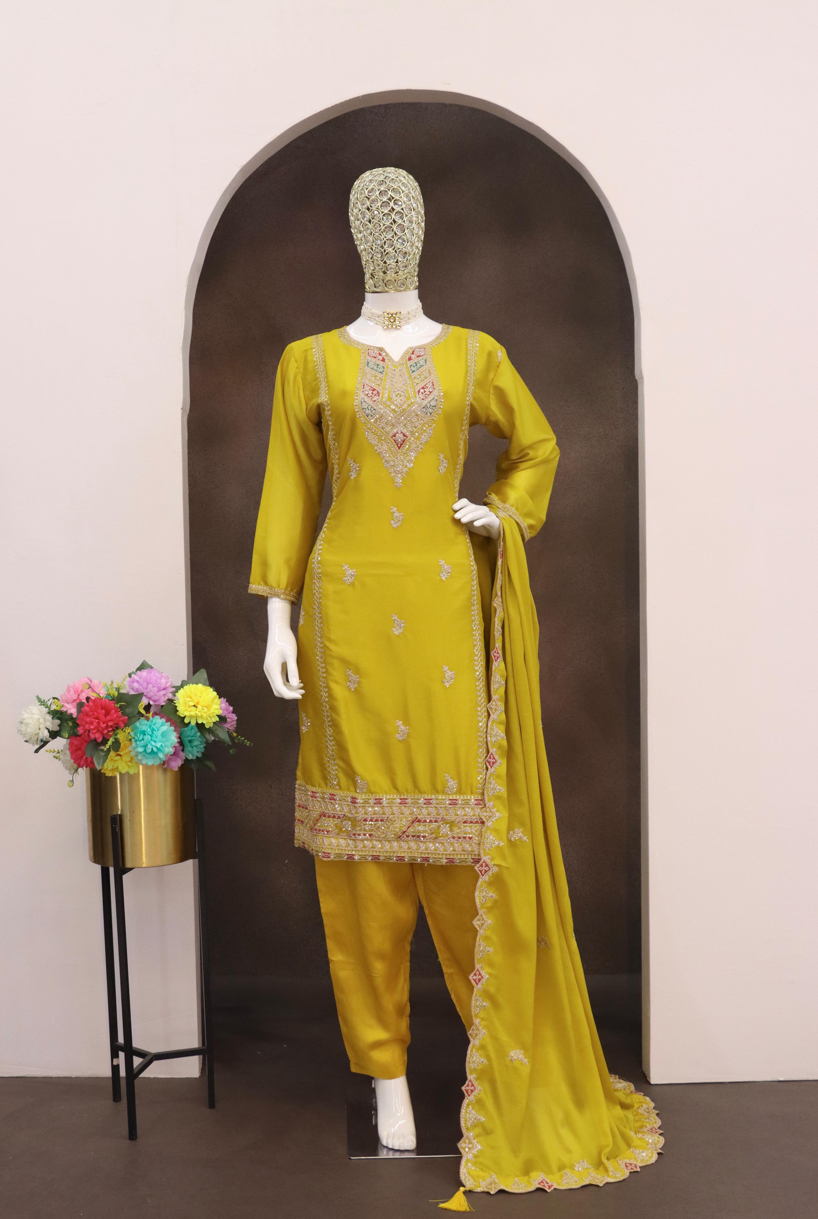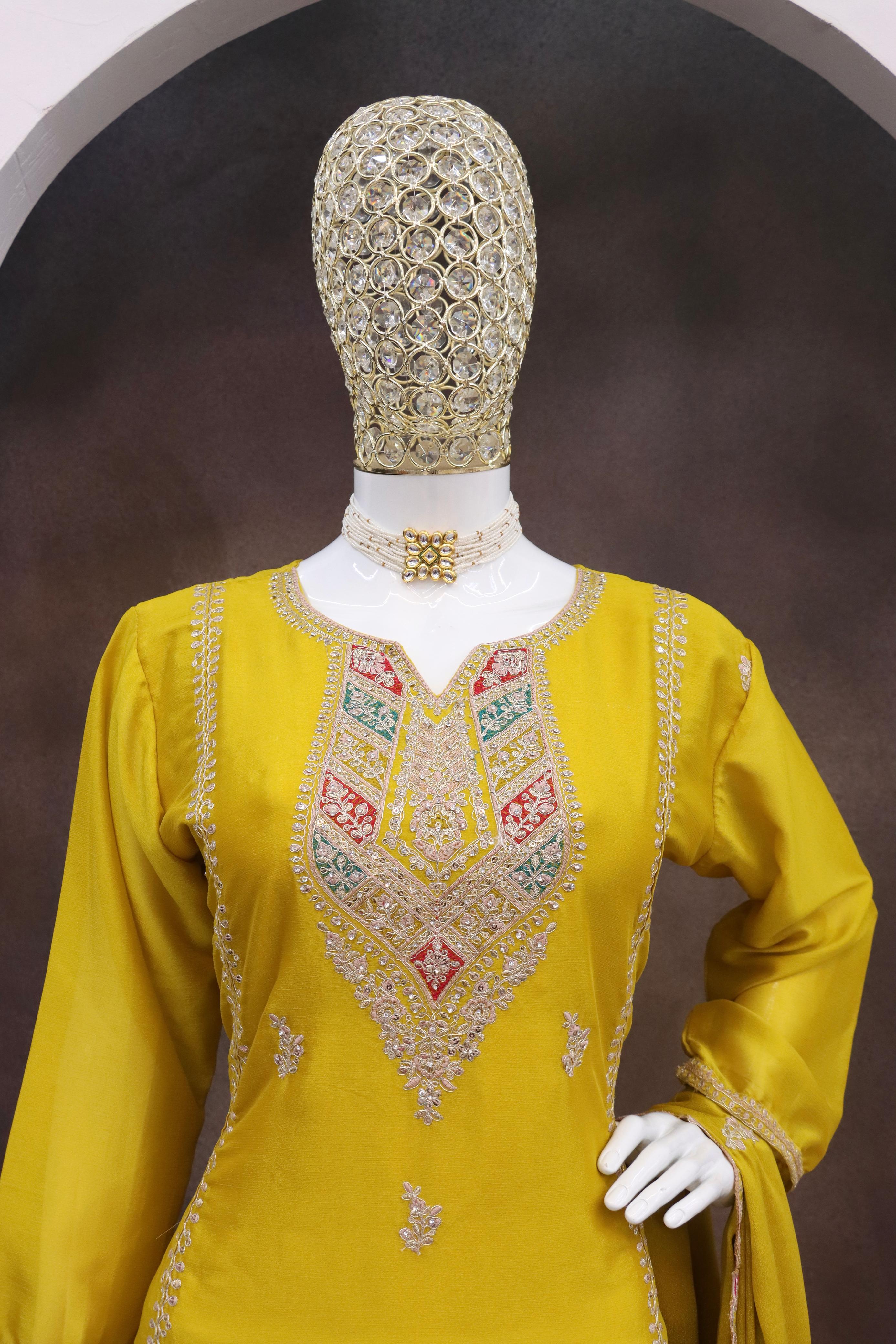 Yellow Heavy Chinon Reaymade Suit with Embroidery & Sequence Work