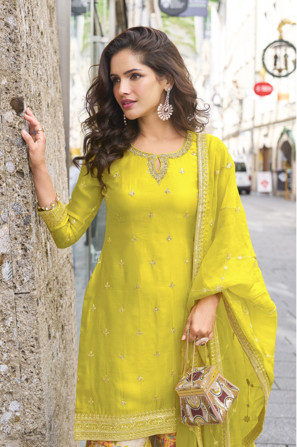 Yellow heavy chinon silk semi stitched palazzo suit with sequence work