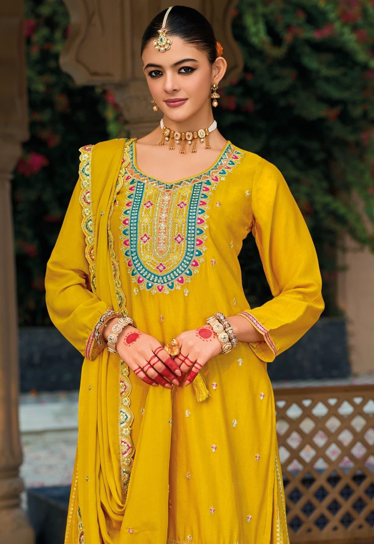 Yellow Premium Embroidered Chinon Readymade Salwar Suit (Free Size)