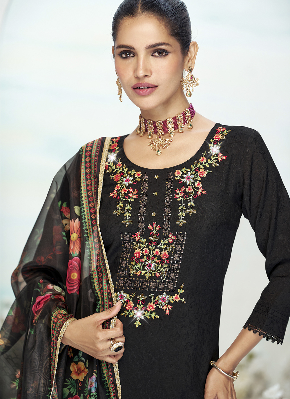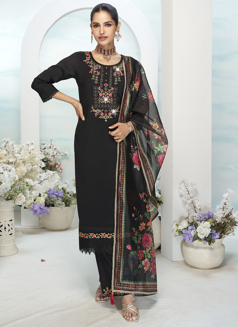 Black Color Ethnic And Beautiful Viscose Silk Fabric Designer Embroidered Suit