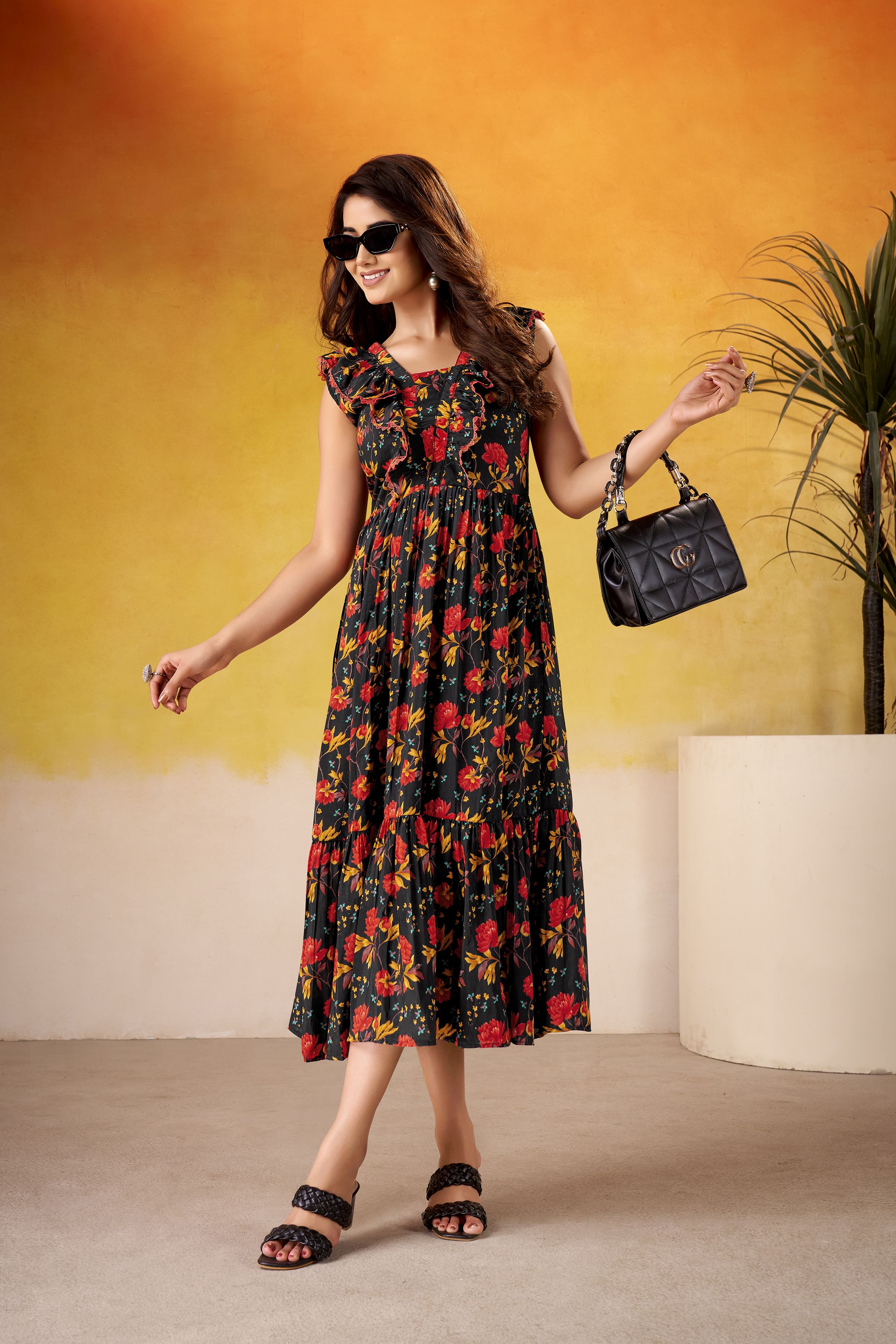 Black Color Maslin Silk Fabric Designer Floral Printed Girlie Partywear Kurti