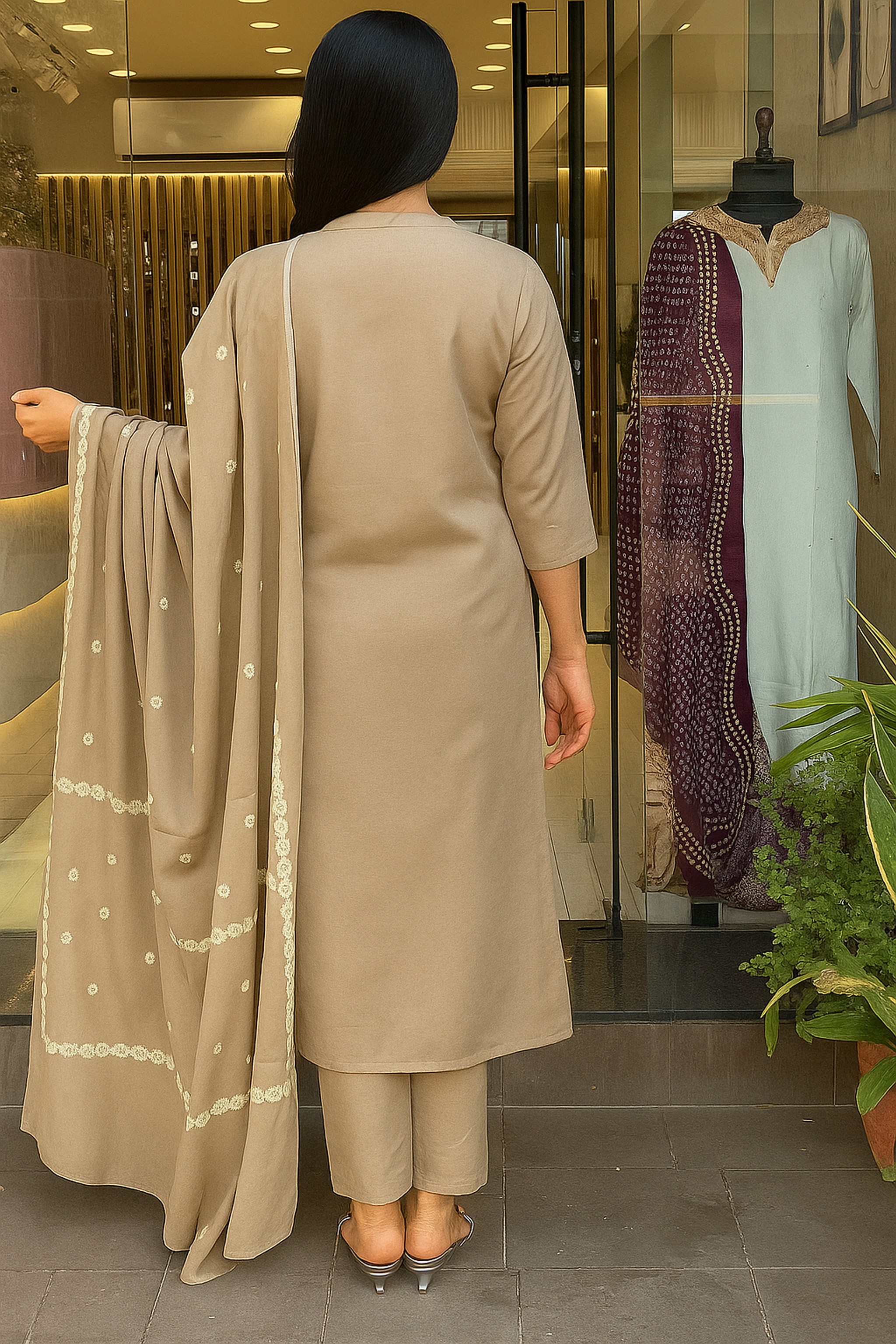 Cream Color Cotton Fabric Designer Embroidered Readymade Kurta Set With Dupatta