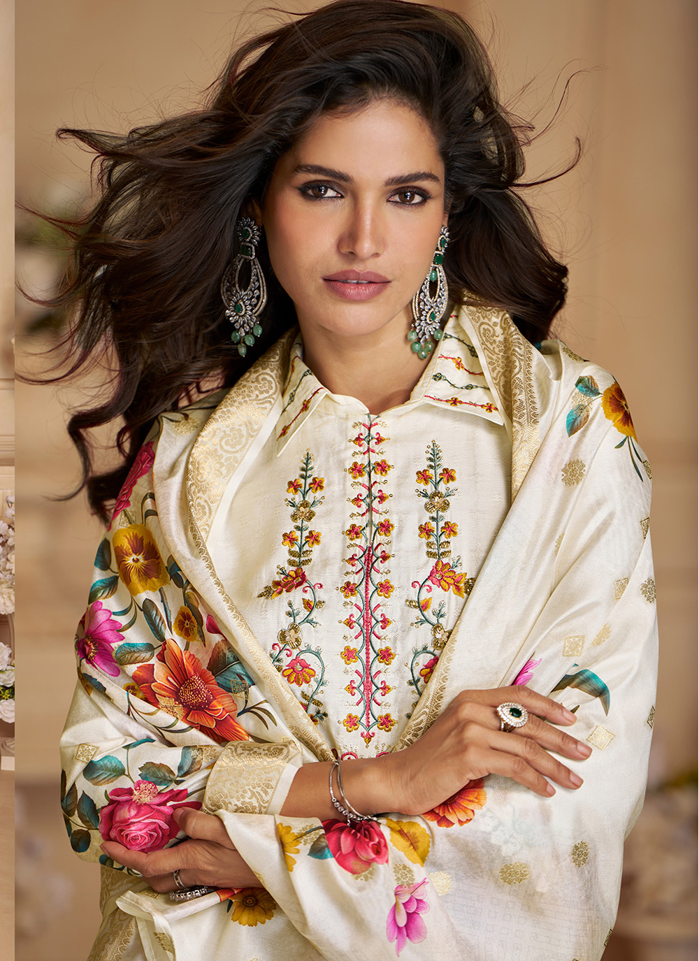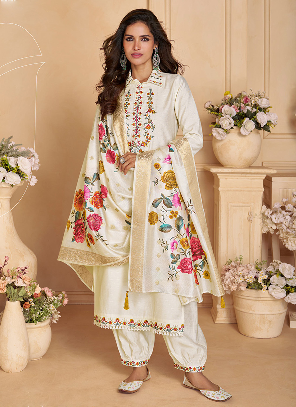 Cream Color Viscose Silk Fabric Designer Embroidered Ceremonial Salwar Kameez